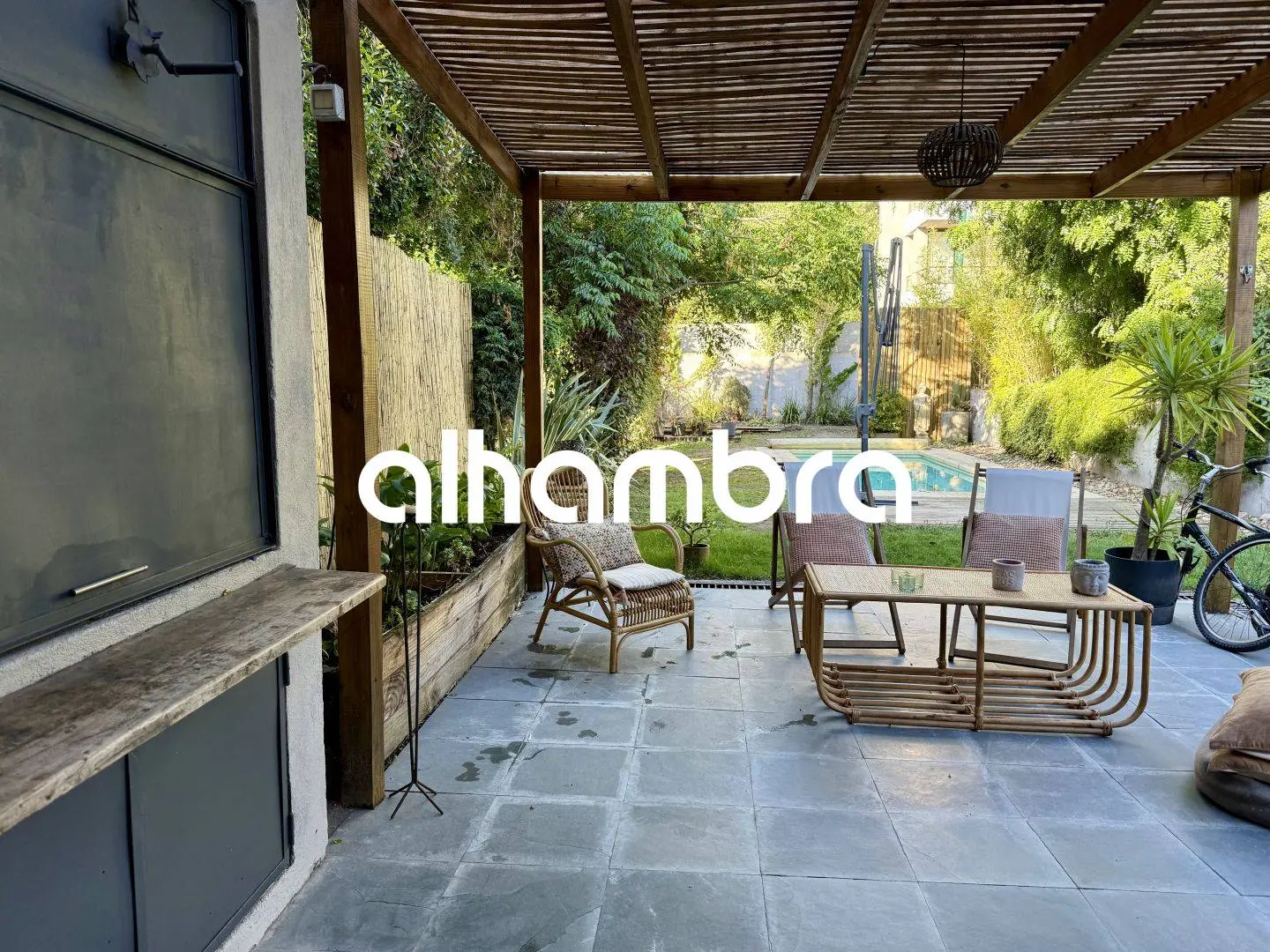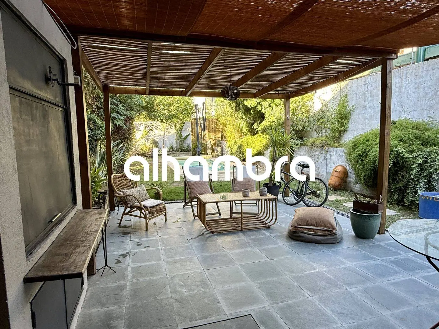 Parrillero techado con pérgola y salida directa al fondo.
