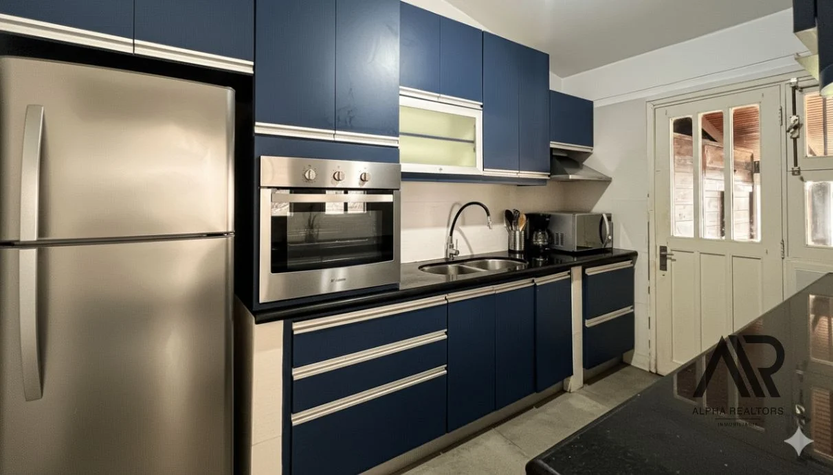 La cocina ofrece un gran potencial por su conectiviad a la sala de estar y con acceso directo al deck exterior, que conecta con una piscina y un parrillero, perfectos para reuniones y momentos de relax al aire libre.
