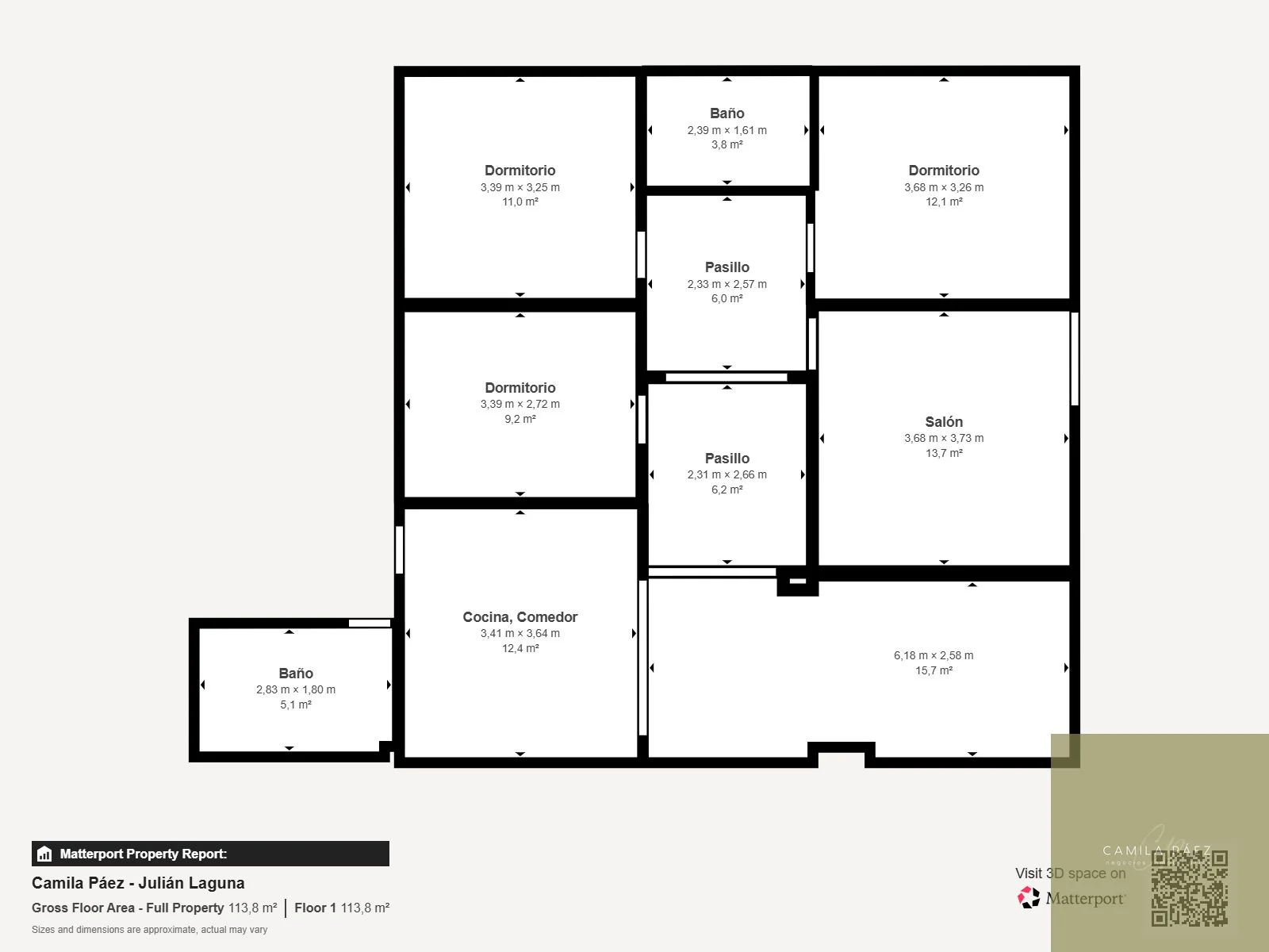 Continuamos en un pasillo de distribución de 12,2 m2 que conecta con las habitaciones, el baño y el living.