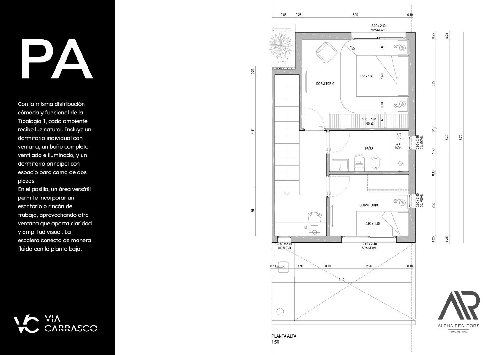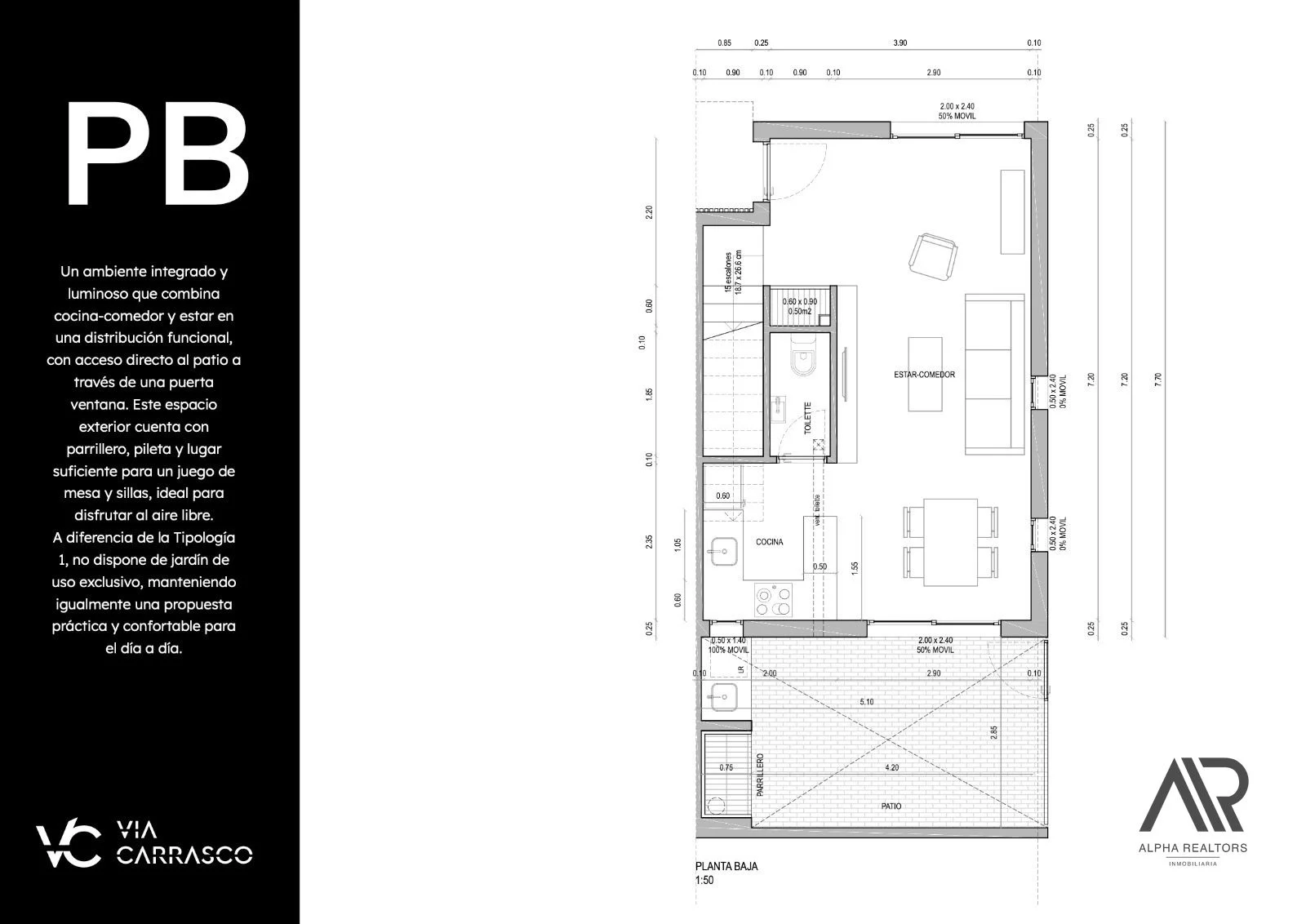 Se trata de un proyecto de 10 casas en formato duplex, las cuales se componen de 2 dormitorios 2 baños completos, patio con parrillero y garaje. En la planta baja tenemos el living comedor con la cocina semi integrada, baño social y salida al patio exclusivo con parrillero que conecta con la cochera. En planta alta encontramos los 2 dormitorios con sus respectivos placares empotrados y otro baño completo.