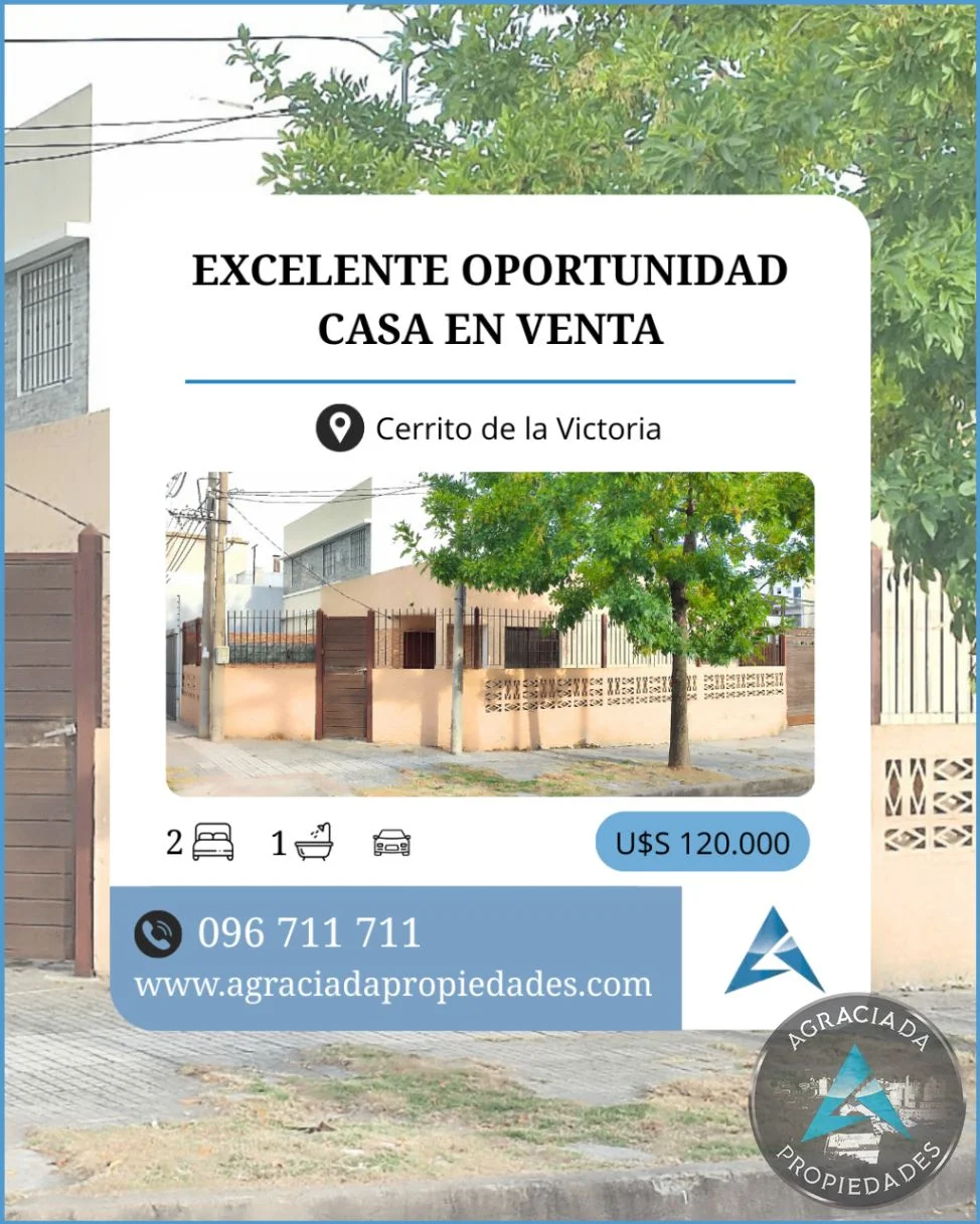 Ubicada en una esquina privilegiada en Cerrito de la Victoria, esta encantadora casa de una planta ofrece un ambiente acogedor y funcional. Con 120 m² de superficie total, la propiedad se compone de 2 cómodos dormitorios, un amplio living y comedor que invita a compartir momentos inolvidables en familia, y una cocina definida ideal para los amantes de la gastronomía. Además, cuenta con un baño y un práctico cuarto de lavado que optimiza el espacio.