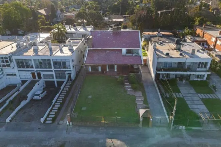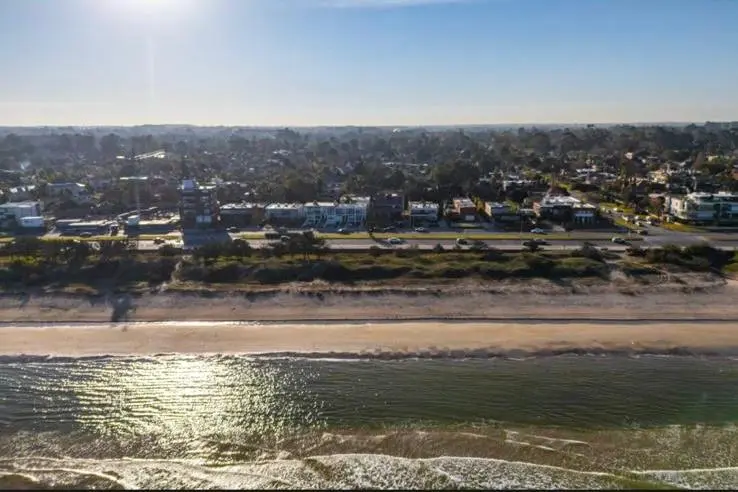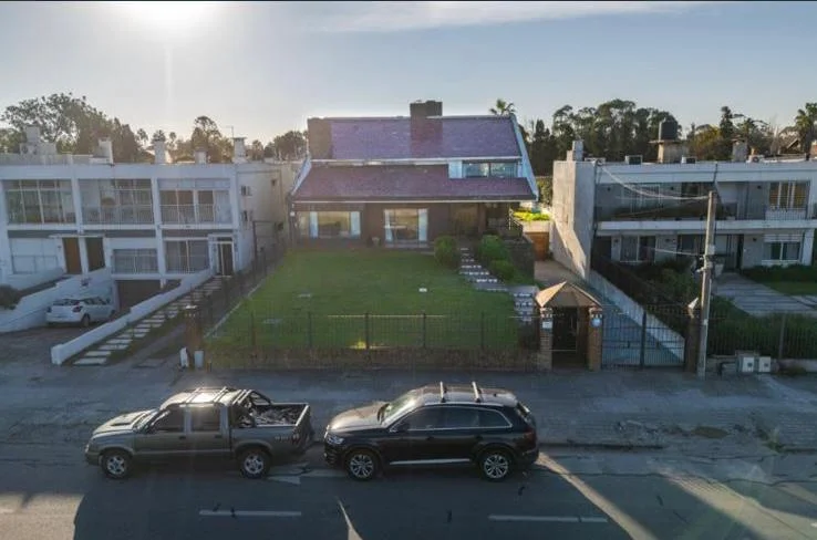 En la planta principal, un hall de entrada conduce a un luminoso living comedor con estufa a leña y ventanales que ofrecen vistas al jardín frontal y a la rambla. En este nivel se encuentra también un baño social, un espacio adaptable como escritorio o playroom, y una cocina amplia con muebles aéreos y bajo mesada de fina carpintería en madera. Además, dispone de dos dormitorios que comparten un baño completo, brindando un entorno cómodo y familiar.