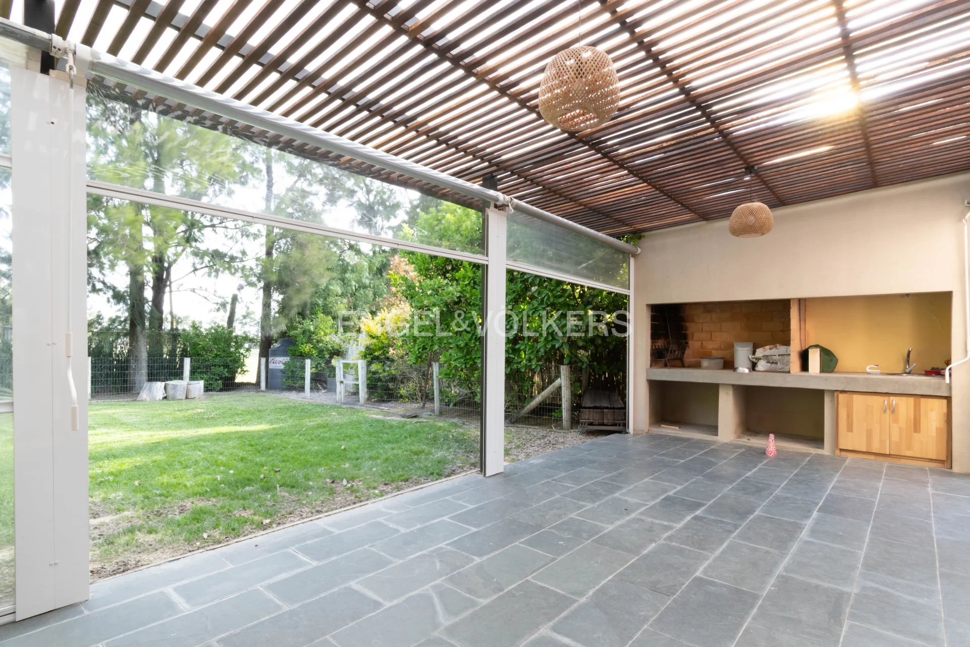 En el exterior, se encuentra una pérgola techada de generosos espacios, con parrillero y cerramiento de exterior con toldos. Jardín privado con conexión a entrada lateral.