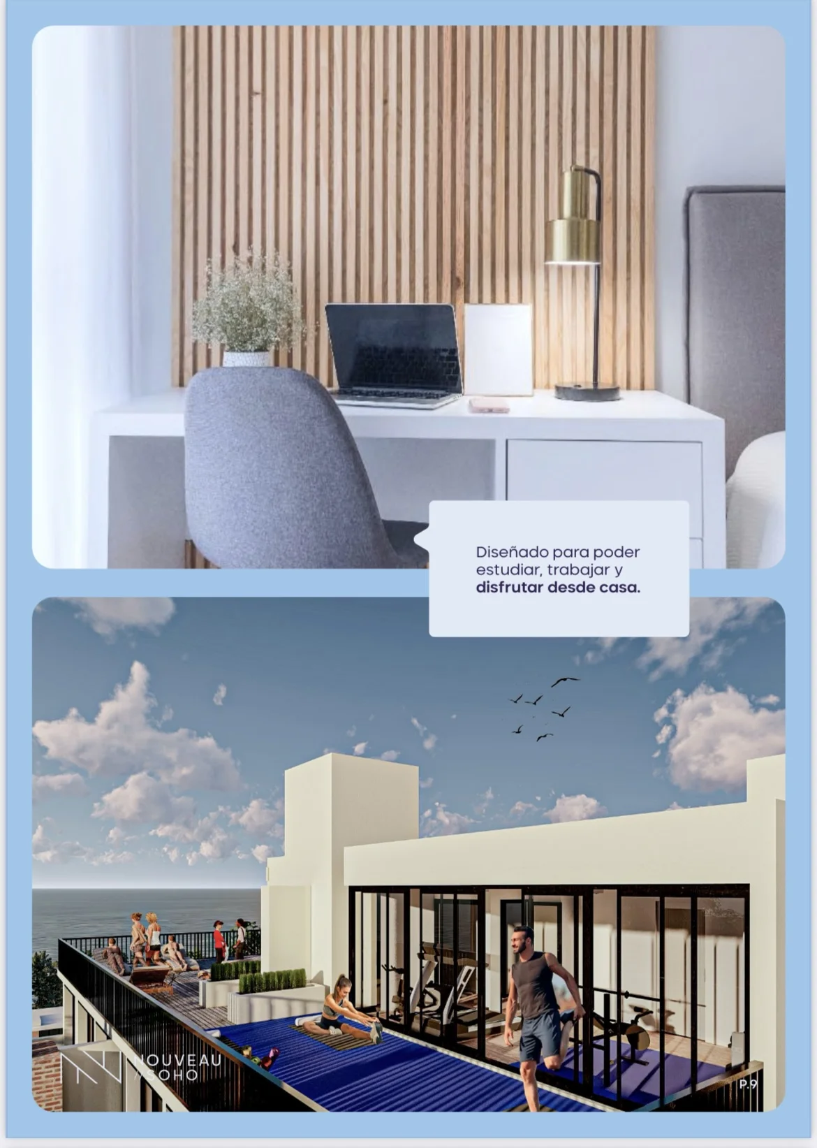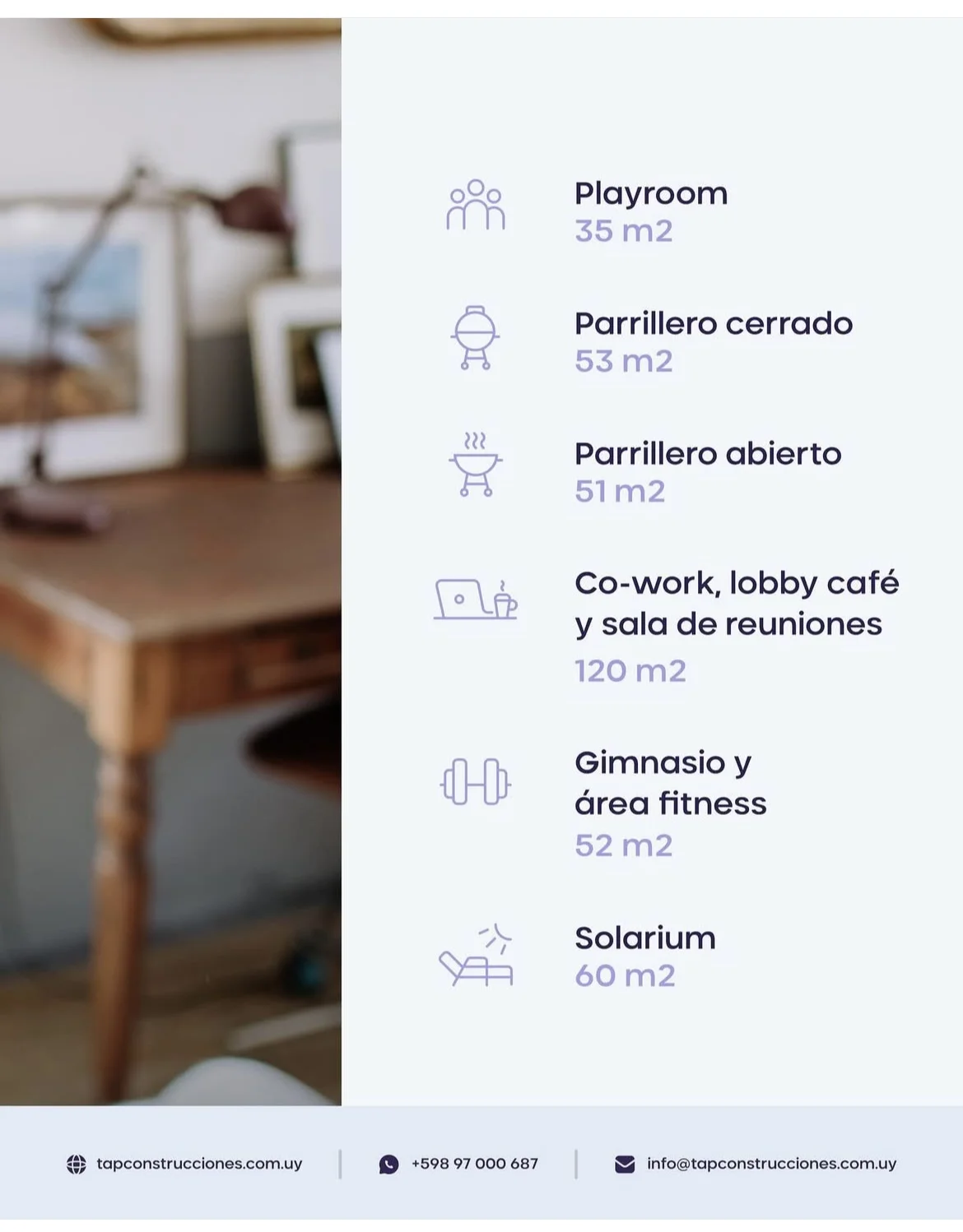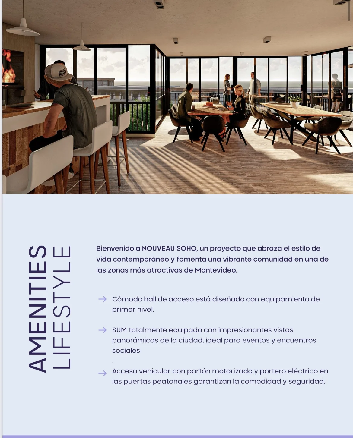 El proyecto mantiene una fachada de valor arquitectónico y ofrece amplios espacios comunes. Entre las amenidades destacan barbacoa abierta y cerrada, solárium, cowork, laundry, gimnasio, sala de reuniones y playroom. El apartamento cuenta con terraza de 2 m² orientada al contrafrente. Incluye cocina y baño. El edificio dispone de ascensor, circuito de cámaras de seguridad y admite mascotas. Los gastos comunes ascienden a 3000 UYU mensuales.