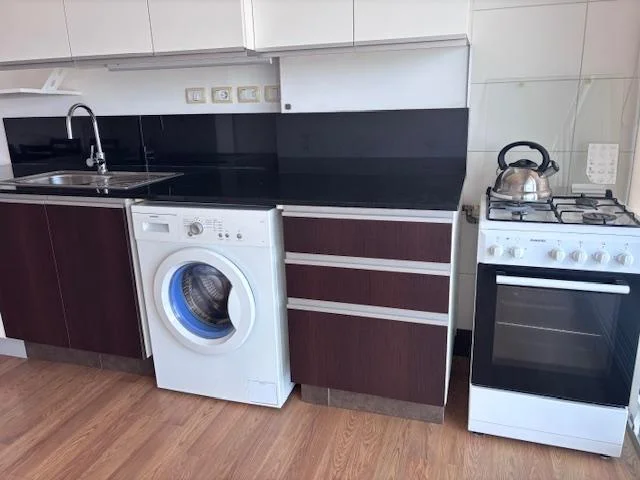 La cocina cuenta con muebles aéreos y bajo mesada, y una cómoda mesada.
