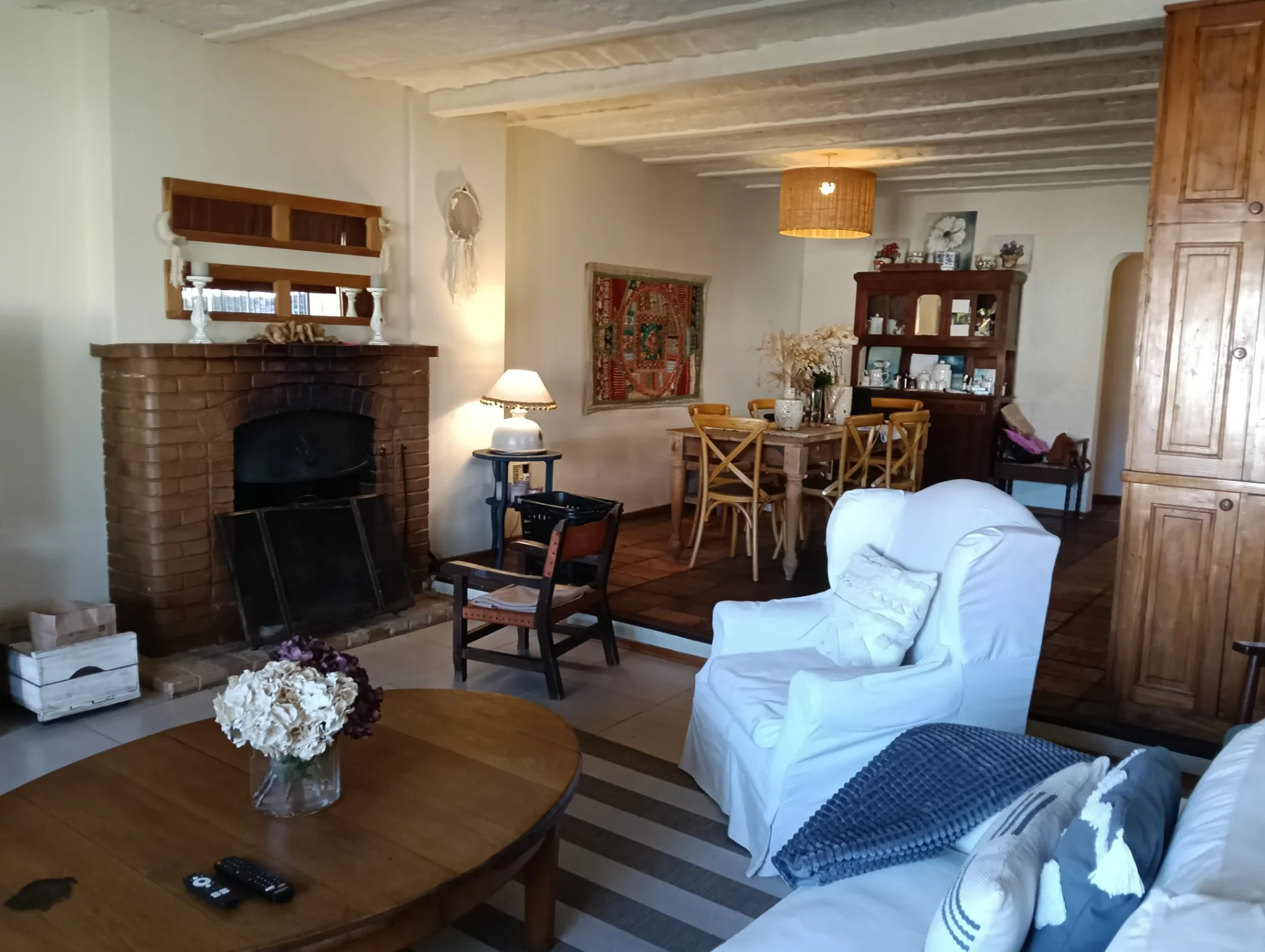 PB: living comedor con estufa a leña y cocina integrada, 1 dormitorio con baño en suite.