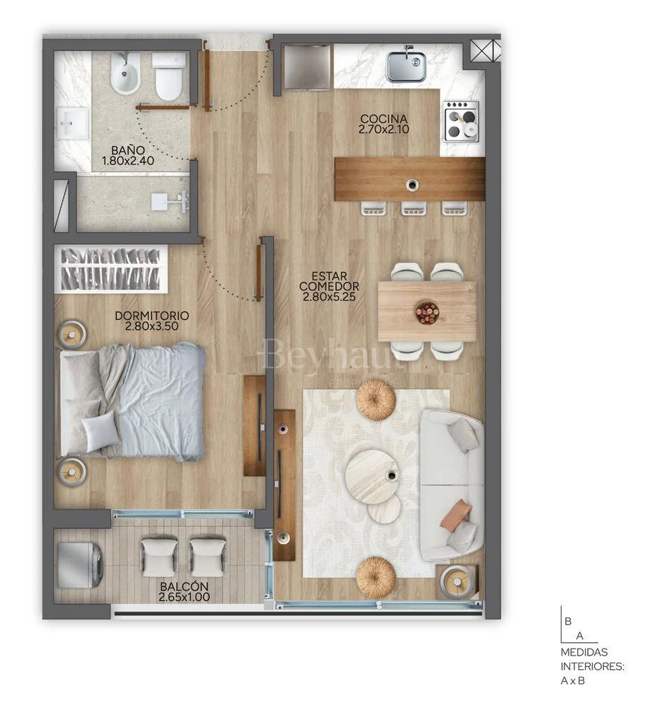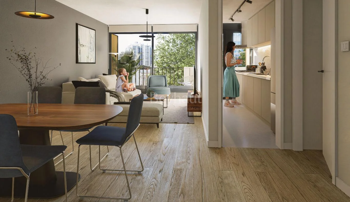 El apartamento tiene cocina integrada al living comedor, baño completo y un dormitorio con salida al balcón desde el mismo y desde el living.