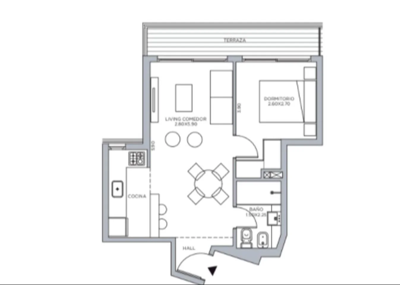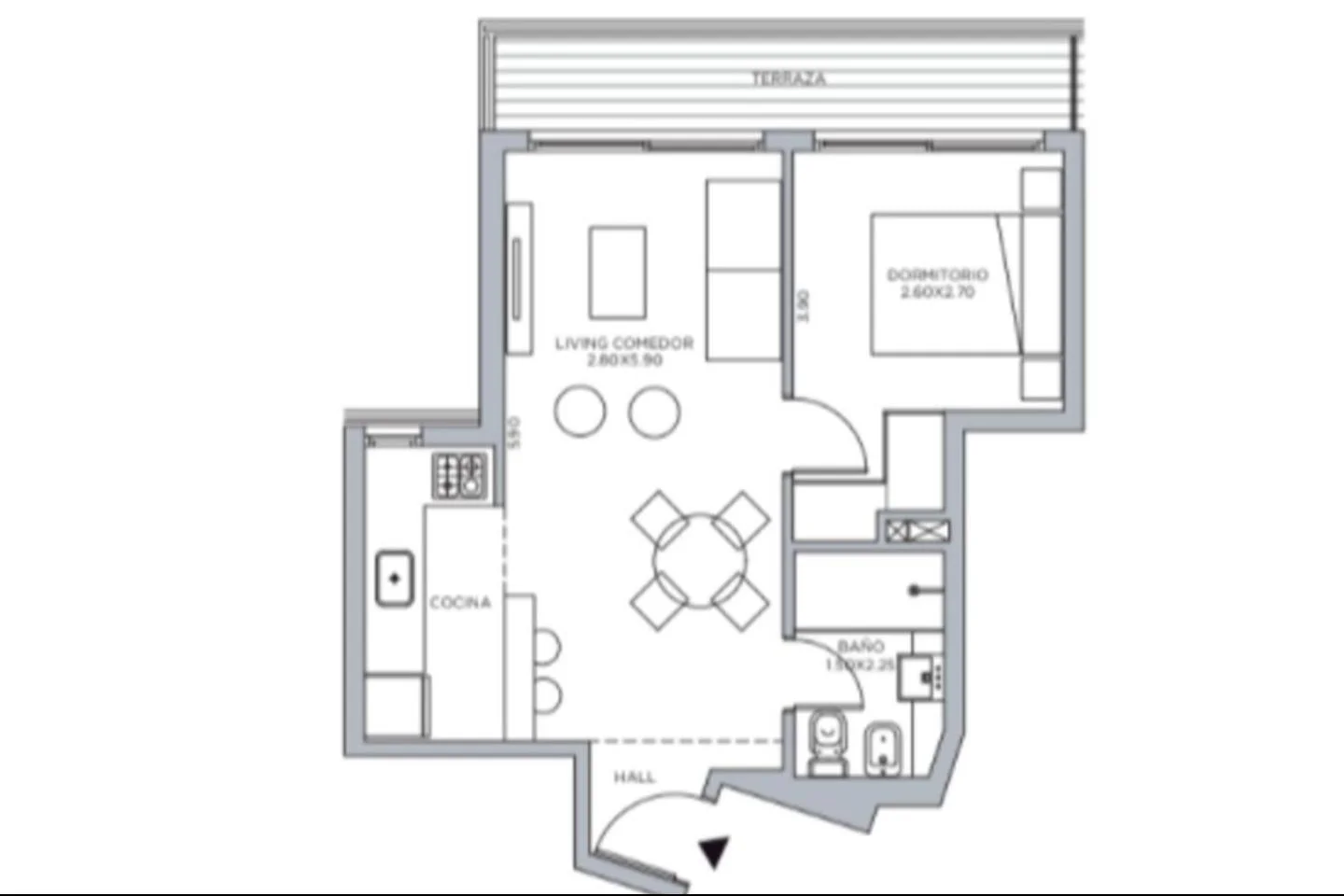 Es un apartamento de 40 m2 construidos y bien distribuidos, más un espacioso balcón de 6,5m2 que abarca el living y el dormitorio.