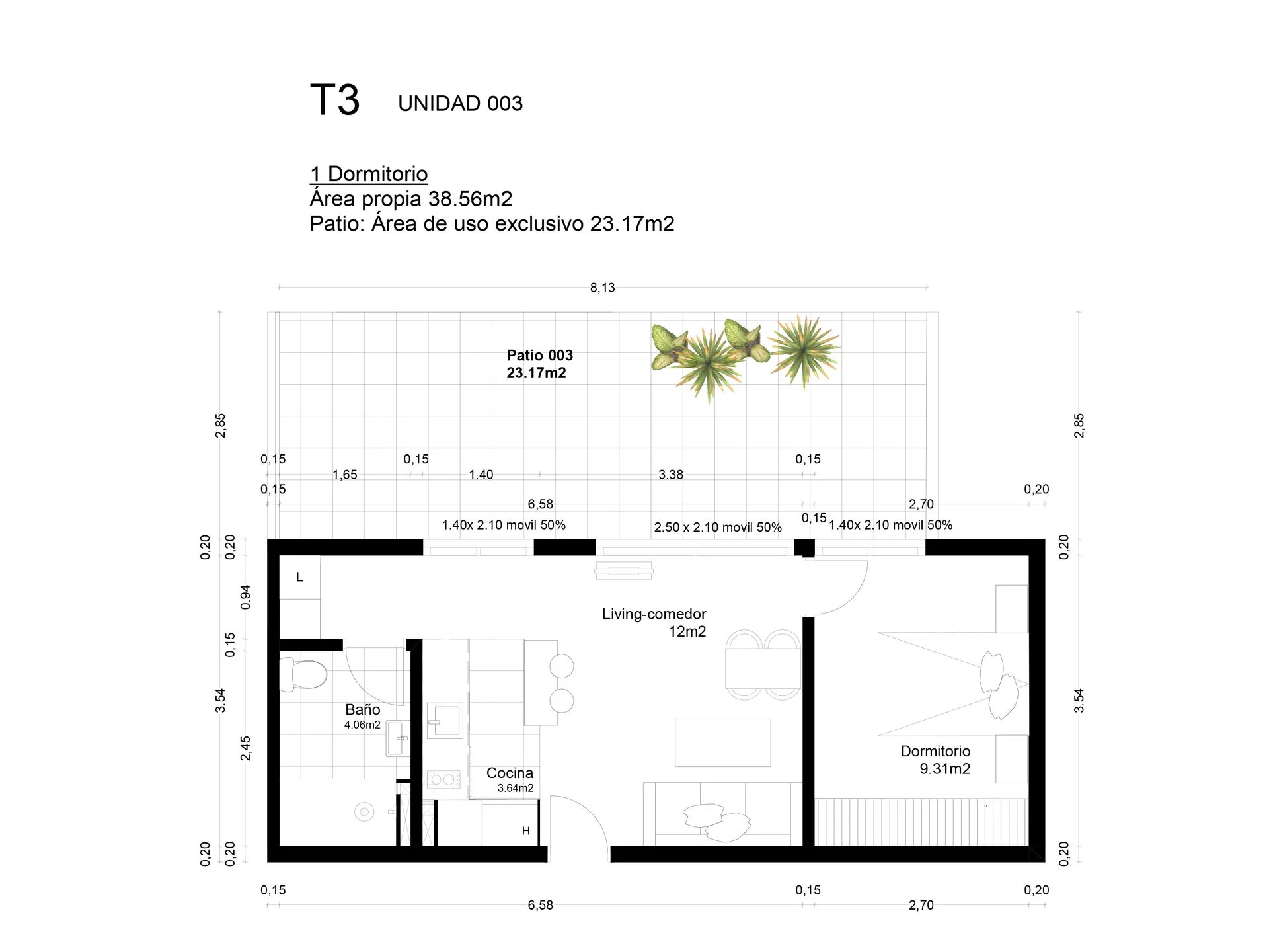 APARTAMENTO DE 1 DORMITORIO DE 39m2, EN PLANTA BAJA CON PATIO EXCLUSIVO DE 23m2.