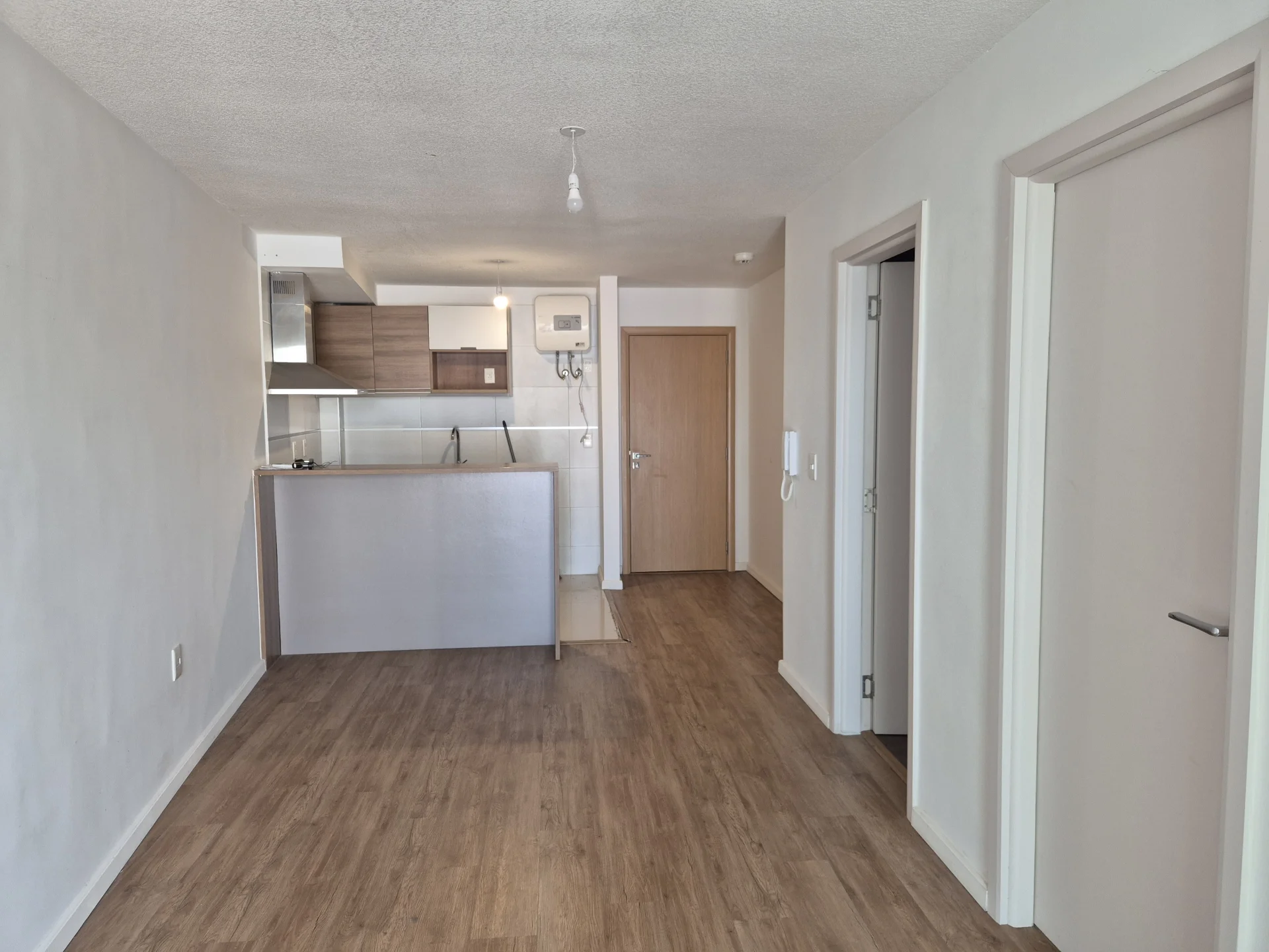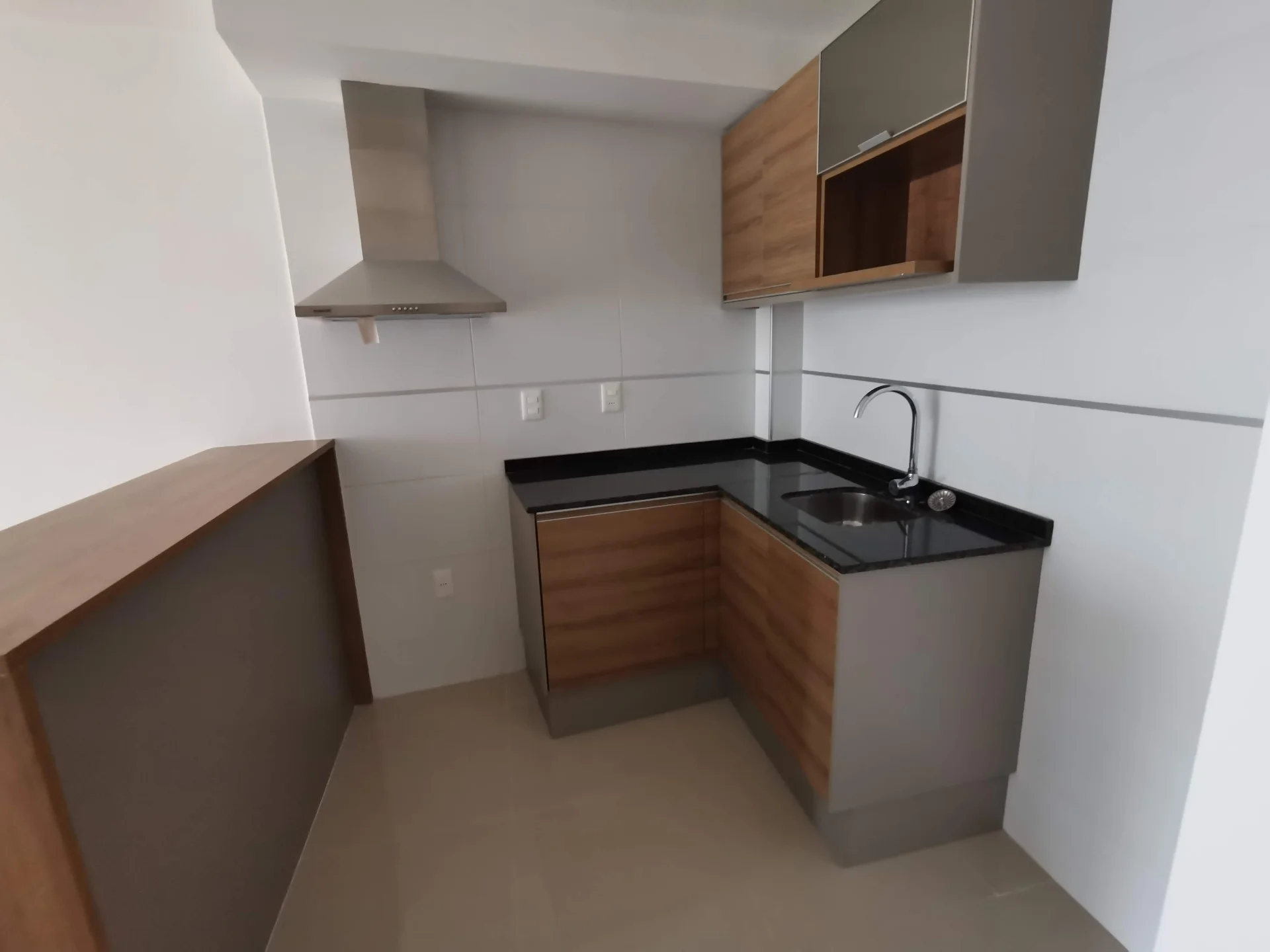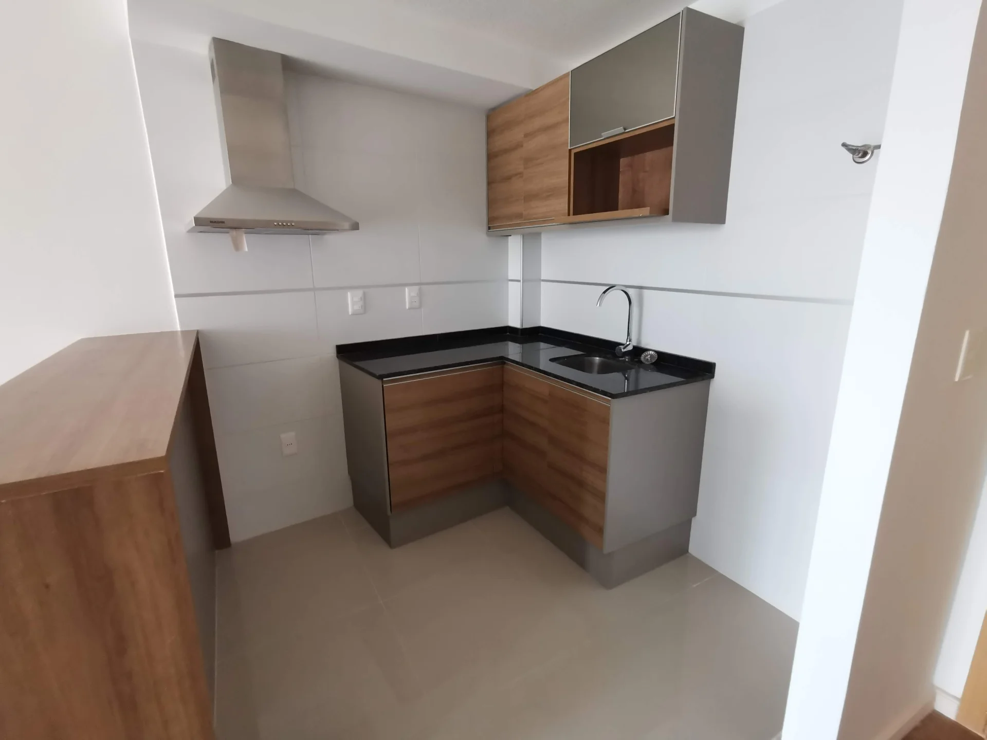 Kitchenette integrada con desayunador, placares aéreos y bajo mesada. Equipada con campana extractora.
