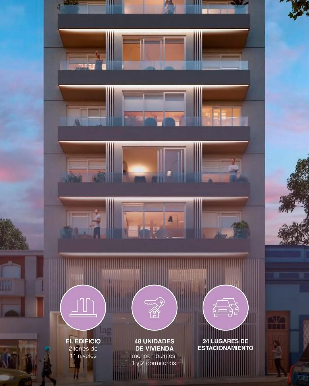 48 unidades con destino vivienda con monoambientes, 1, 2 y hasta 3 dormitorios.