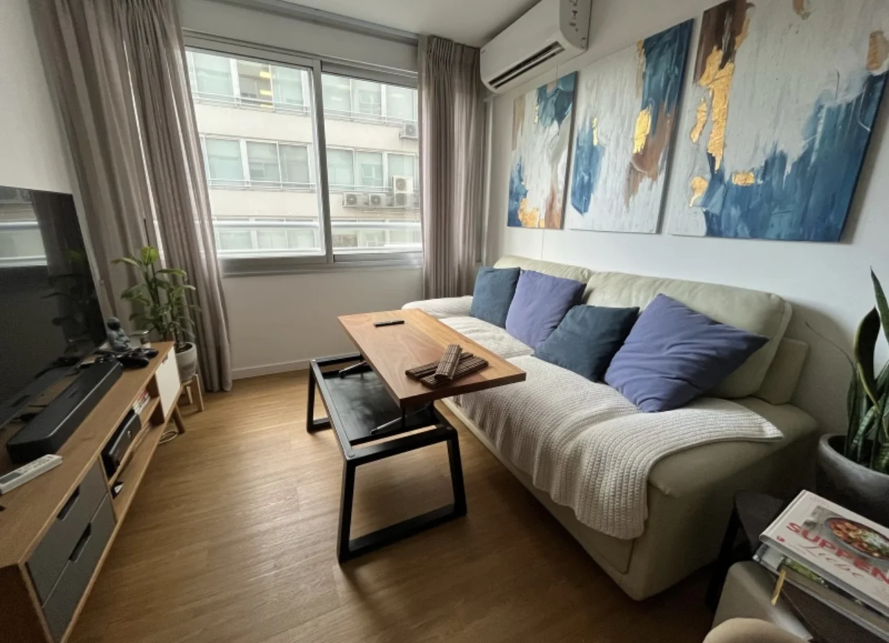 • Living comedor integrado con cocina, gran ventanal y aire acondicionado