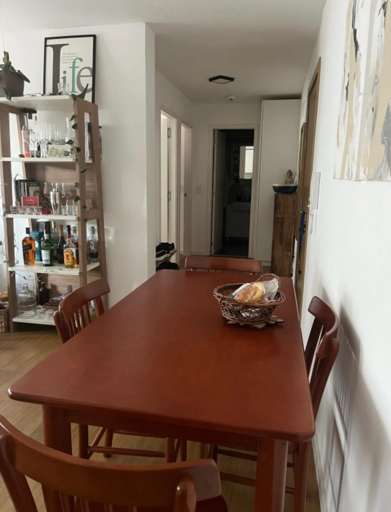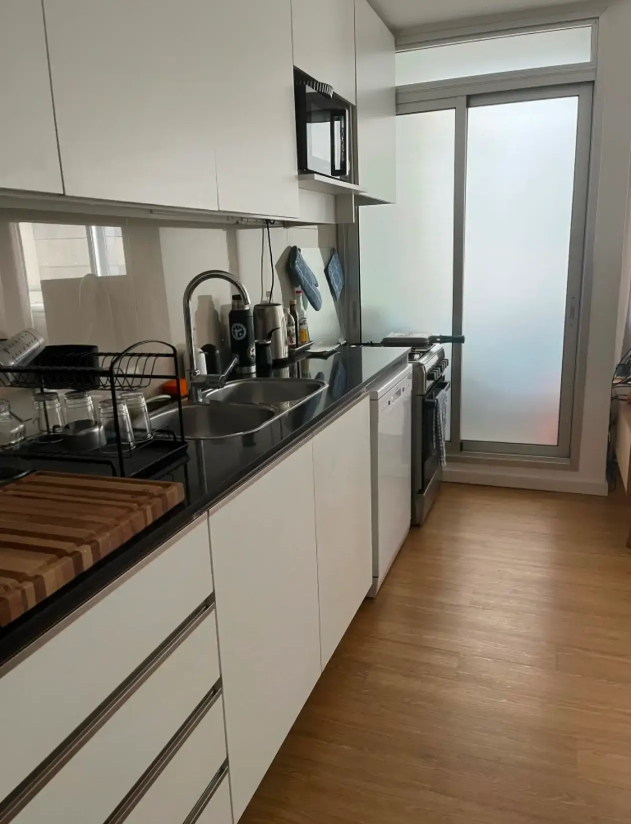 • Cocina completa con bacha doble, amplia mesada, campana de extracción y gran capacidad de almacenamiento en muebles aéreos y bajo mesada. Posibilidad de conexión para lavarropas o lavavajillas. Además, cuenta con espacio para un calefón de 30 litros.