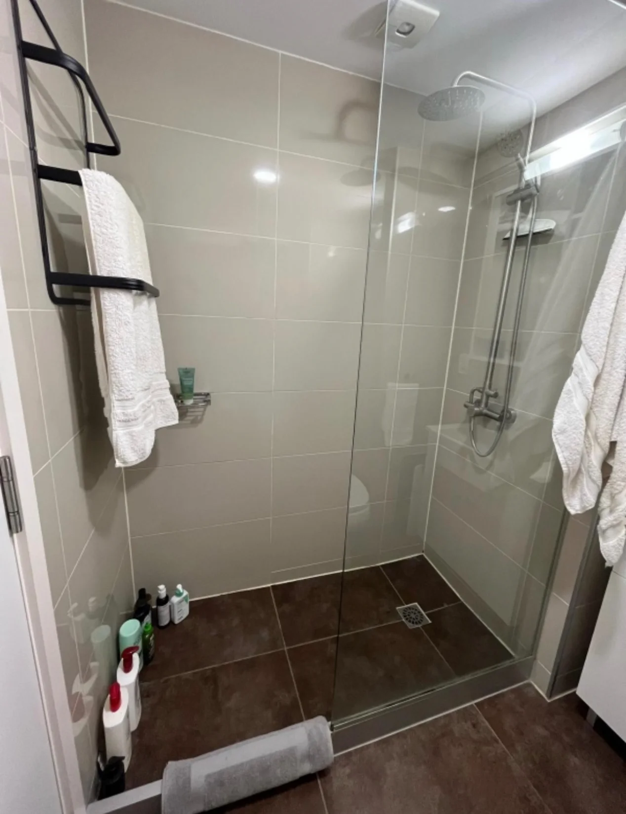 Baño completo con mampara de vidrio, barra de ducha, toallero, calefón de 60 litros y mucho espacio de almacenamiento bajo mesada, tras espejo y aéreo.