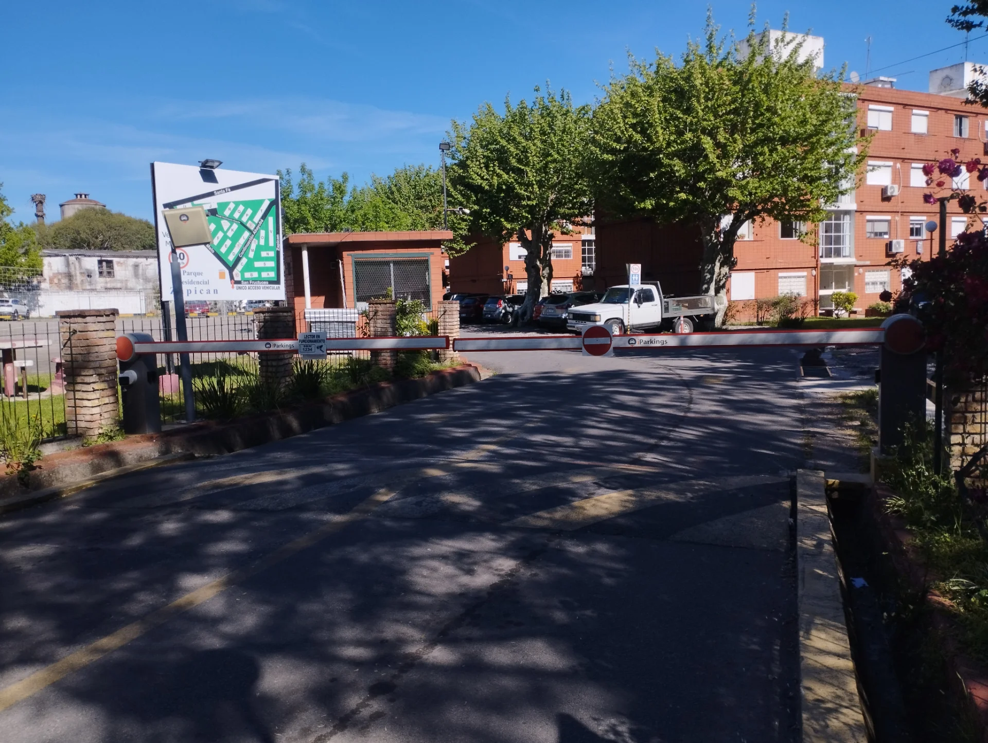 Cuenta con estacionamiento dentro del predio del parque para hasta dos autos, con barreras y vigilancia las 24 horas.
