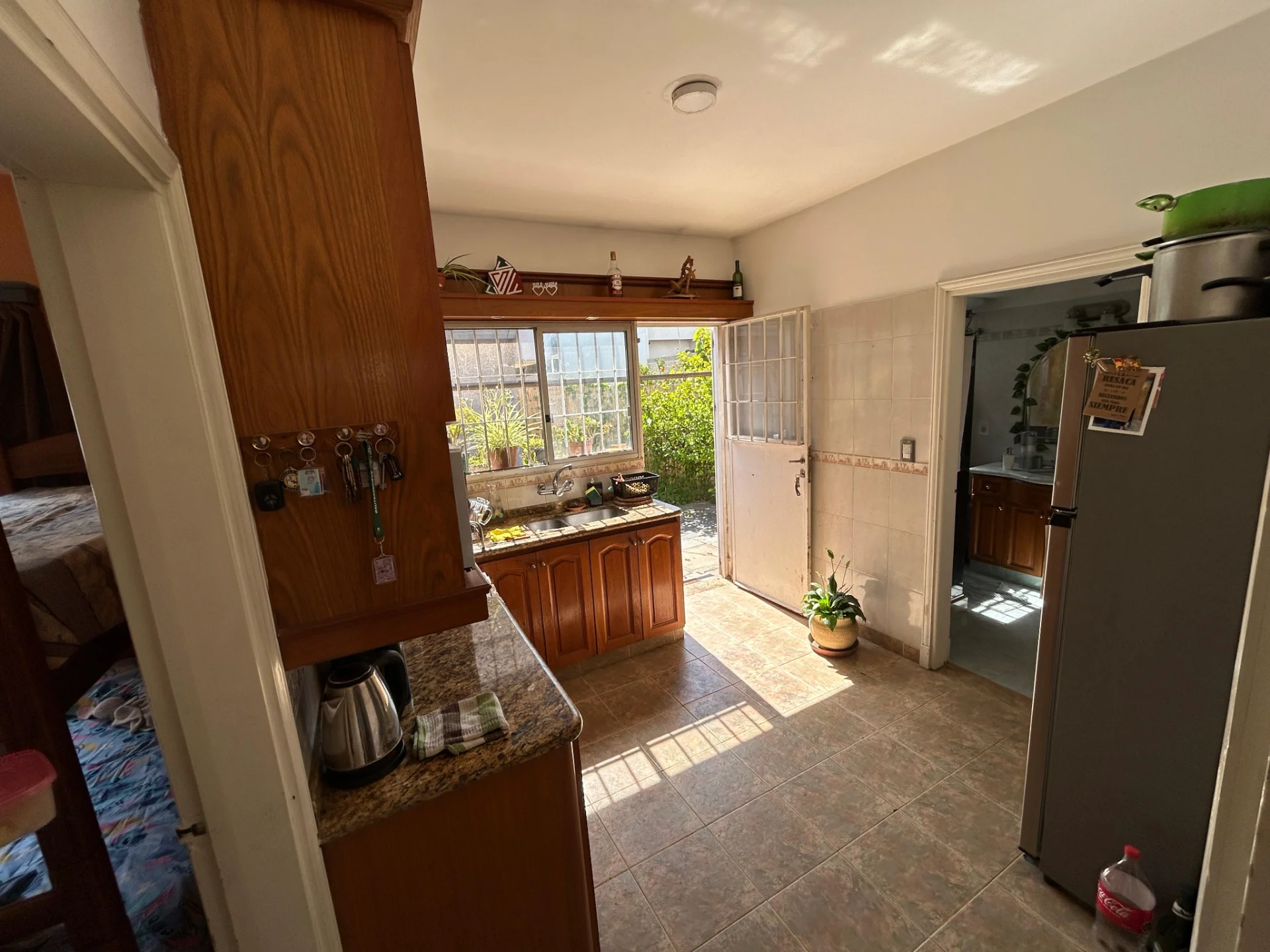 Cocina completa, con muebles bajo mesada y aéreos en madera. Ventana con puerta en la cocina que dan para el fondo.