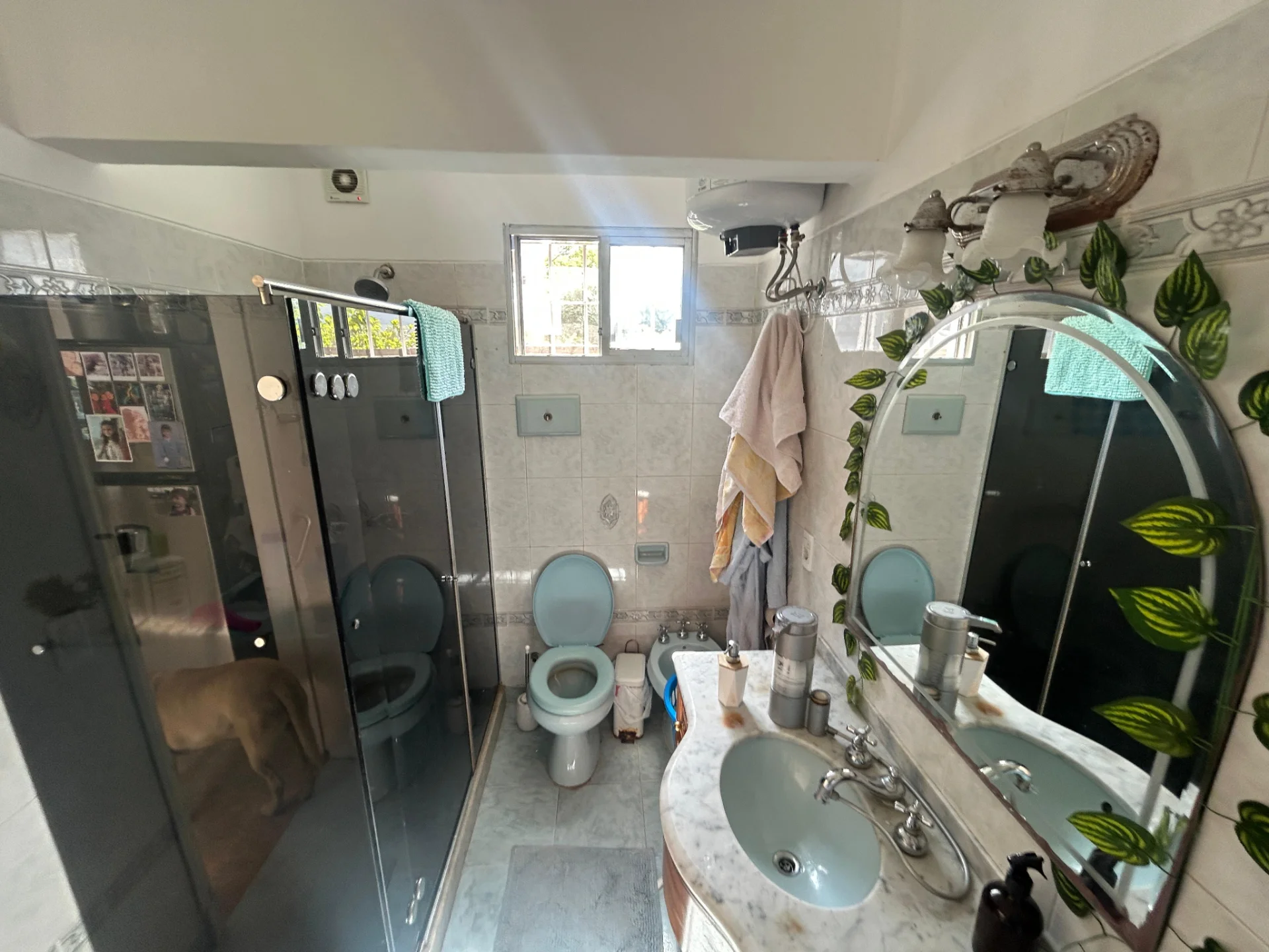 Baño completo y funcional, con mueble empotrado de guardado, y pileta con guarda bultos debajo. Bañera con mampara de vidrio.