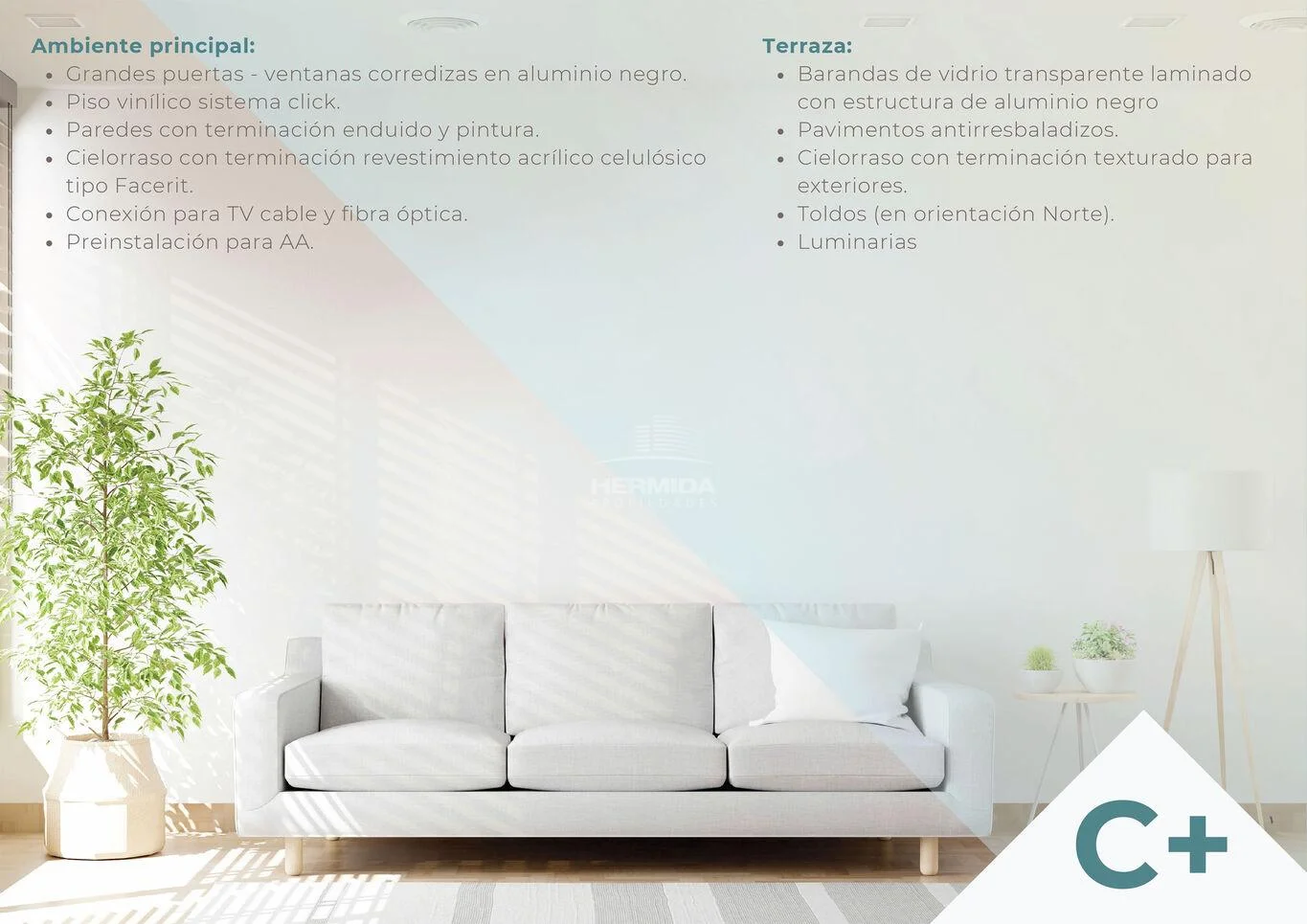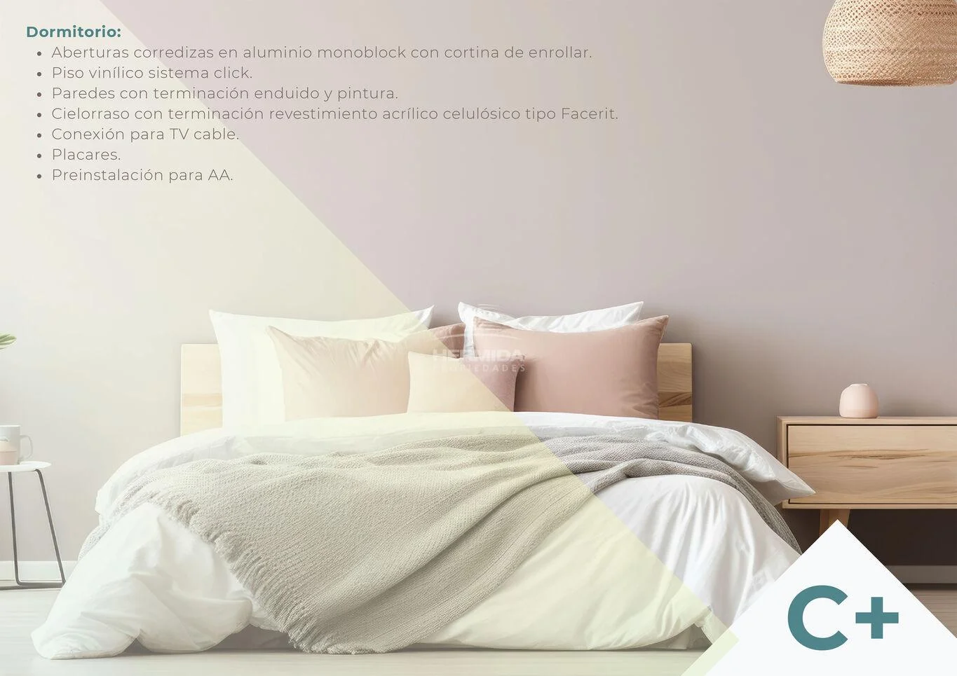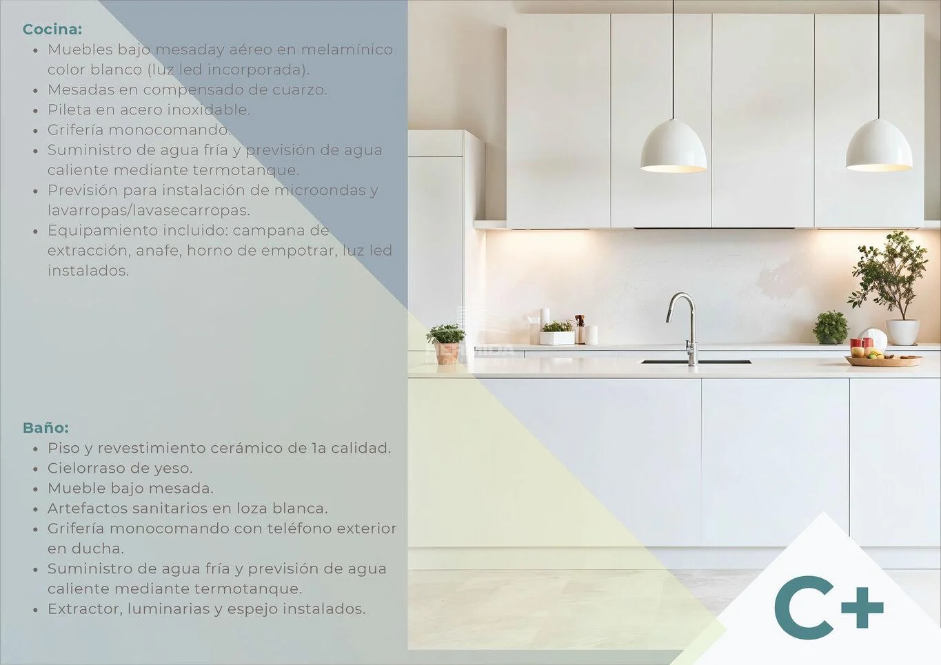 Placard en dormitorio, cocina equipada con horno, anafe, campana, baño equipado con espejo, mueble bajo mesada, extractor, luces en cielorraso, previsión para Aire Acondicionado, previsión para Lavarropas y termofón. Toldos exteriores para la orientación Norte, luminarias exteriores.