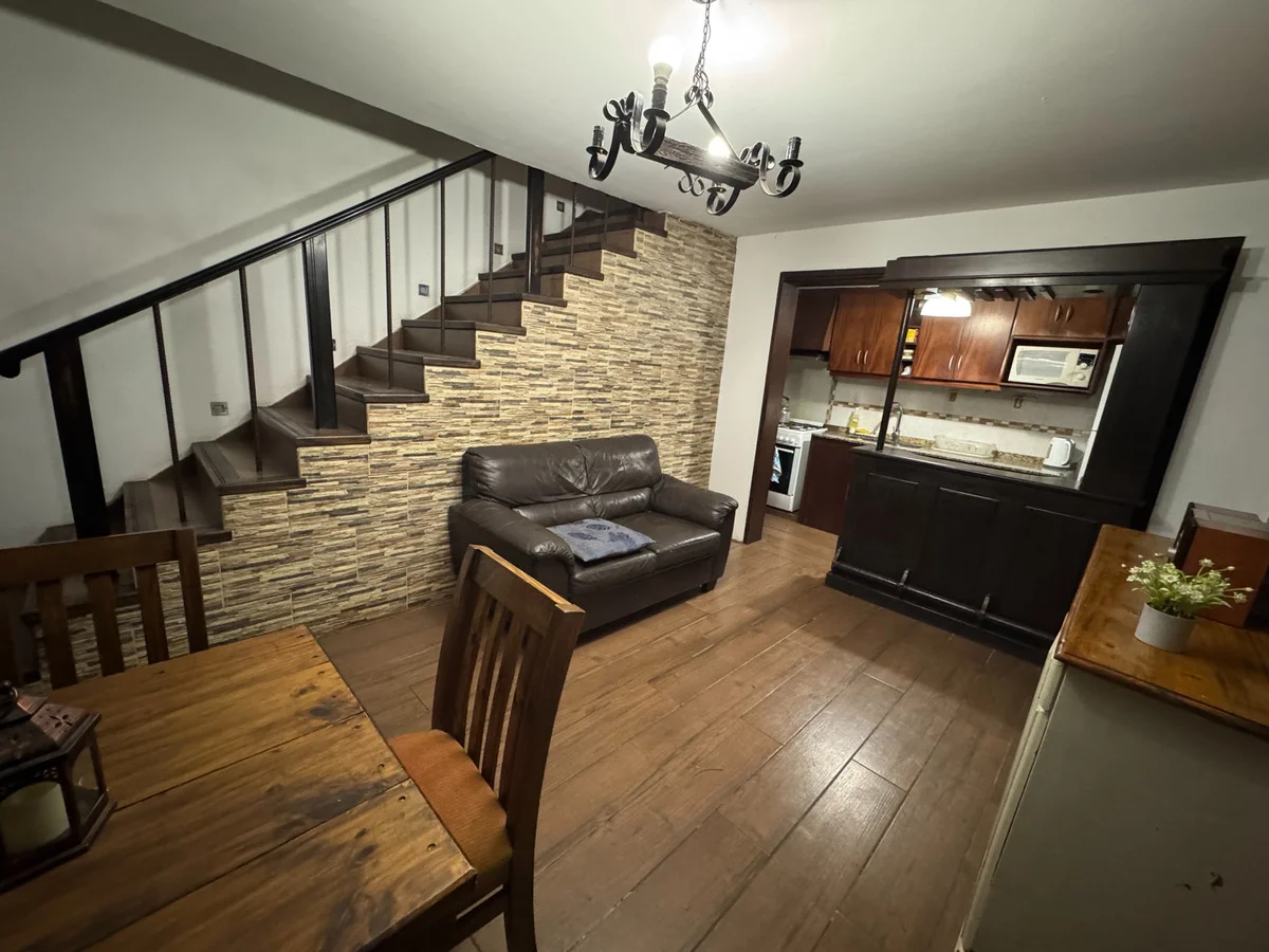 La planta baja se desarrolla con living comedor, estufa a leña, cocina con con placares aéreos, bajo mesada y barra desayunador, baño social y pequeño fondo.