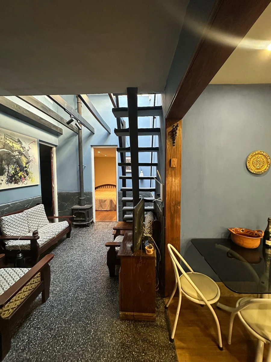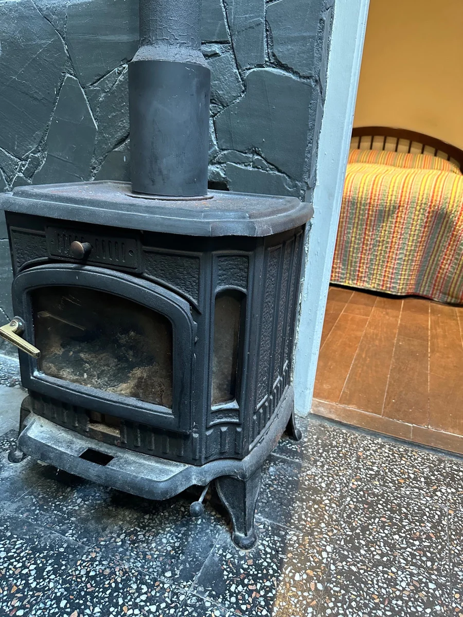 living con estufa a leña, baño con bañera.