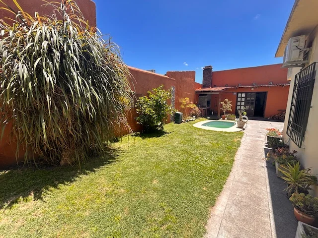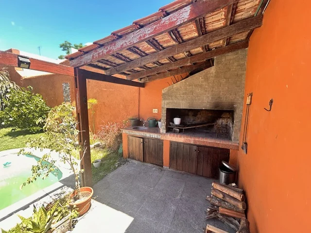 Salida al fondo con área verde, piscina, parrillero techado y barbacoa al fondo equipada con estufa a leña, baño, cocina y depósito de herramientas.