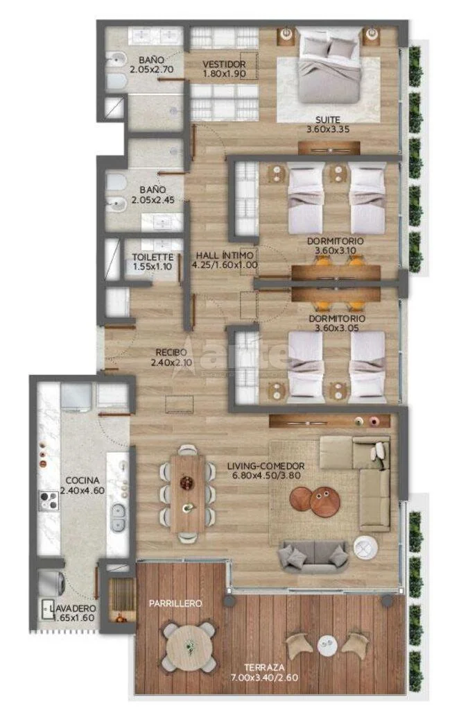 Unidad muy amplia esquinera con doble orientación divina terraza exclusiva con parrillero, 3 dormitorios muy cómodos con muy buenos placares de alta calidad, la suite con vestidor, además baño de vistas y hermosa cocina definida con su terraza lavadero.