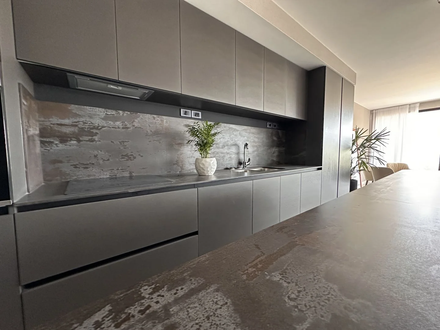 Muebles Todesquini con cocina, heladera, microondas y campana, todo integrado en un mueble especialmente diseñado para que se integra al ambiente de manera natural.