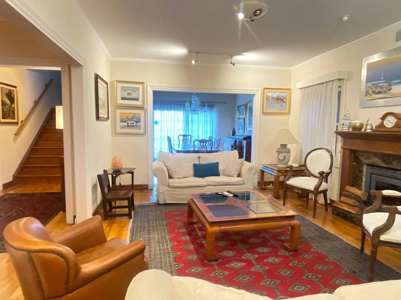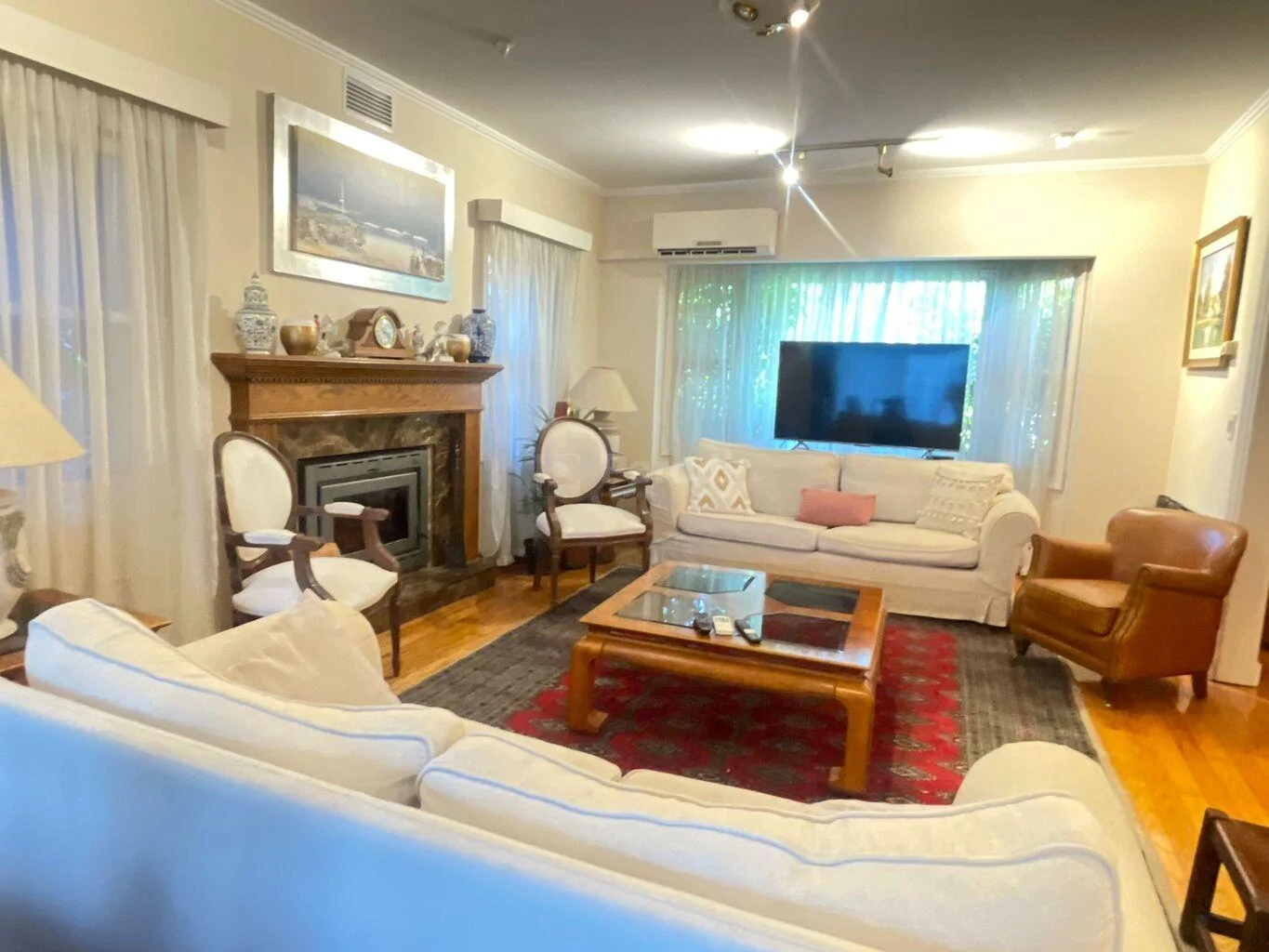 Living con estufa a leña y al jardín, conecta mediante una arcada al comedor con vista y ventanal al fondo