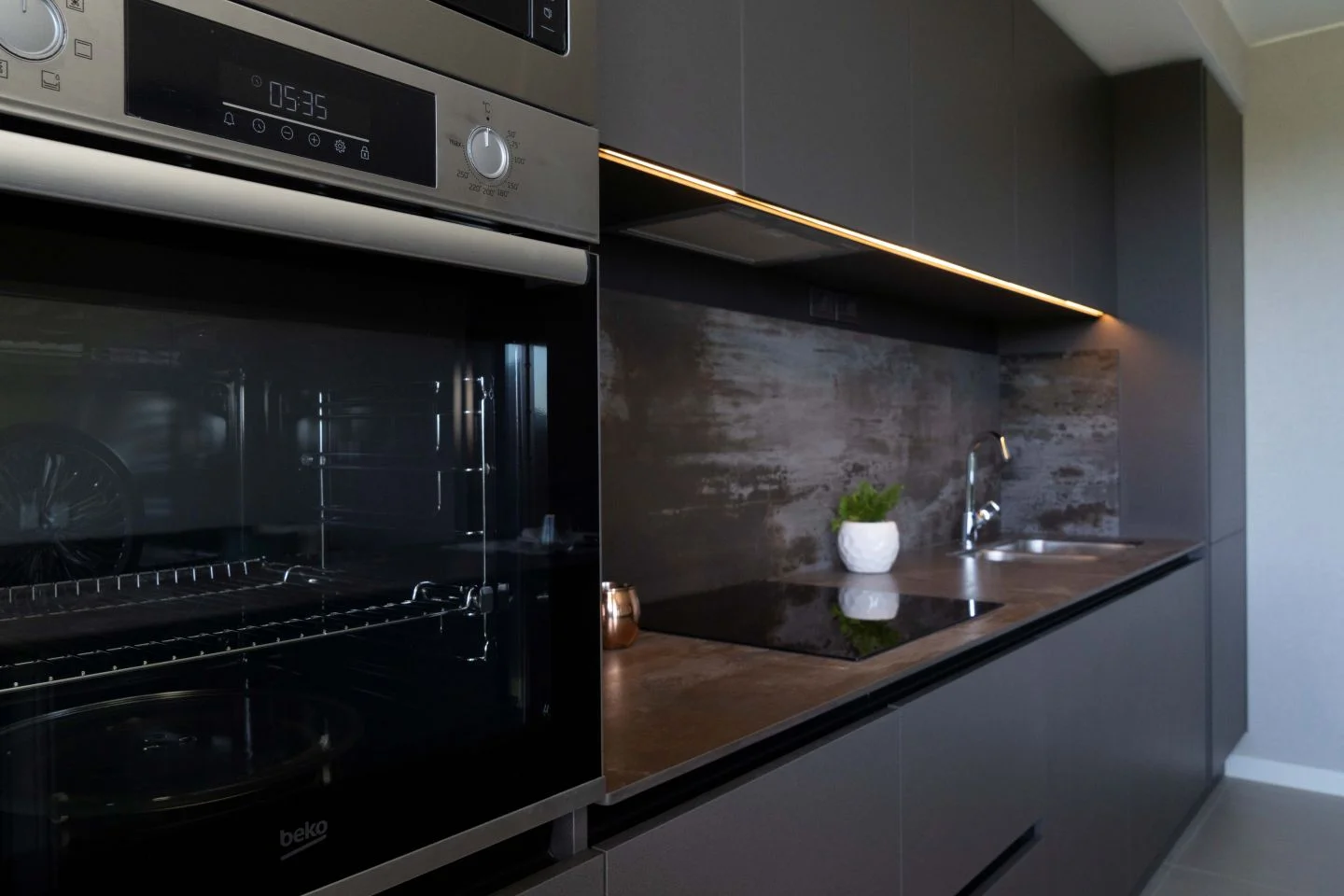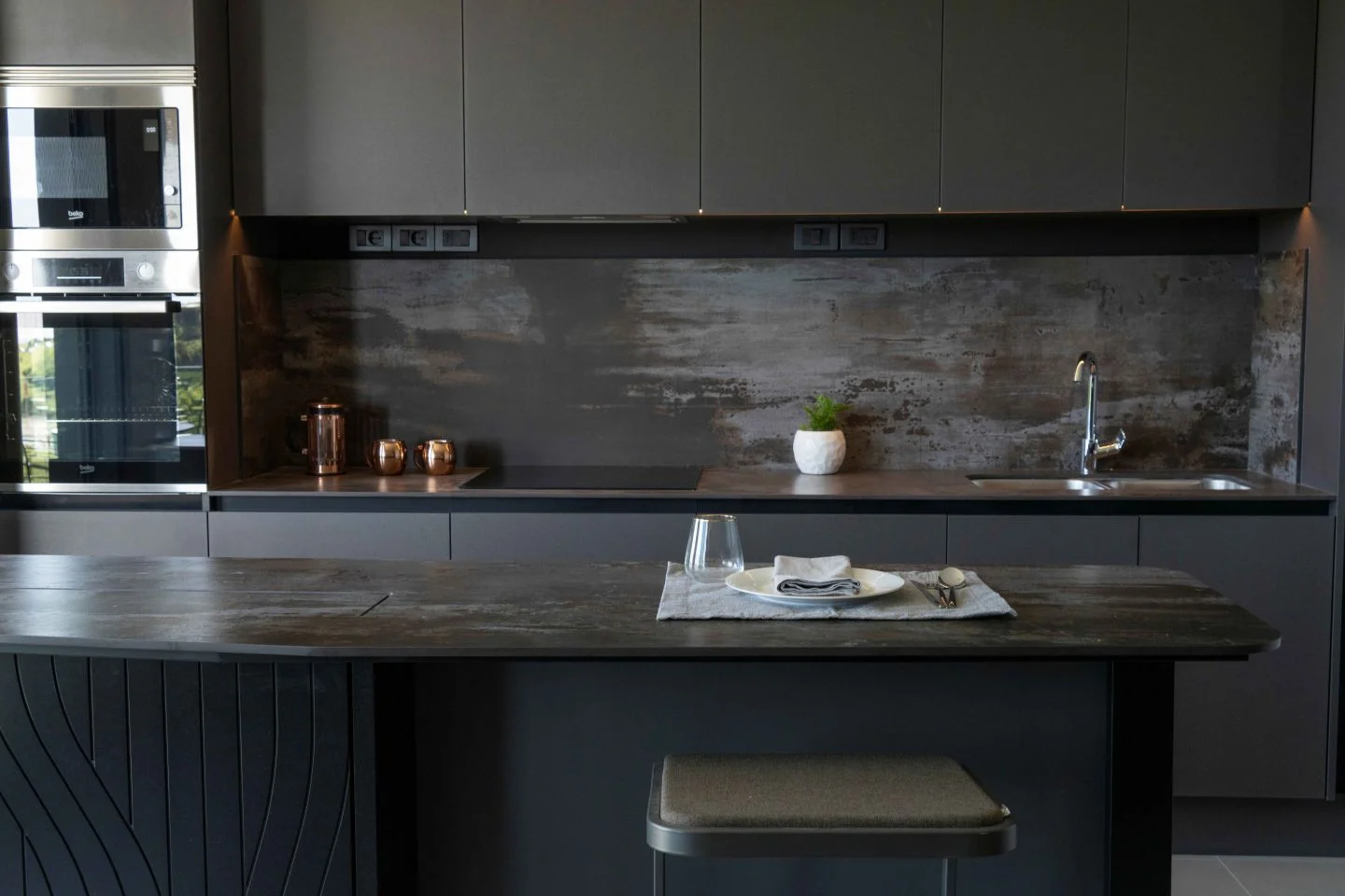 Muebles Todesquini con cocina, heladera, microondas y campana, todo integrado en un mueble especialmente diseñado para que se integra al ambiente de manera natural.