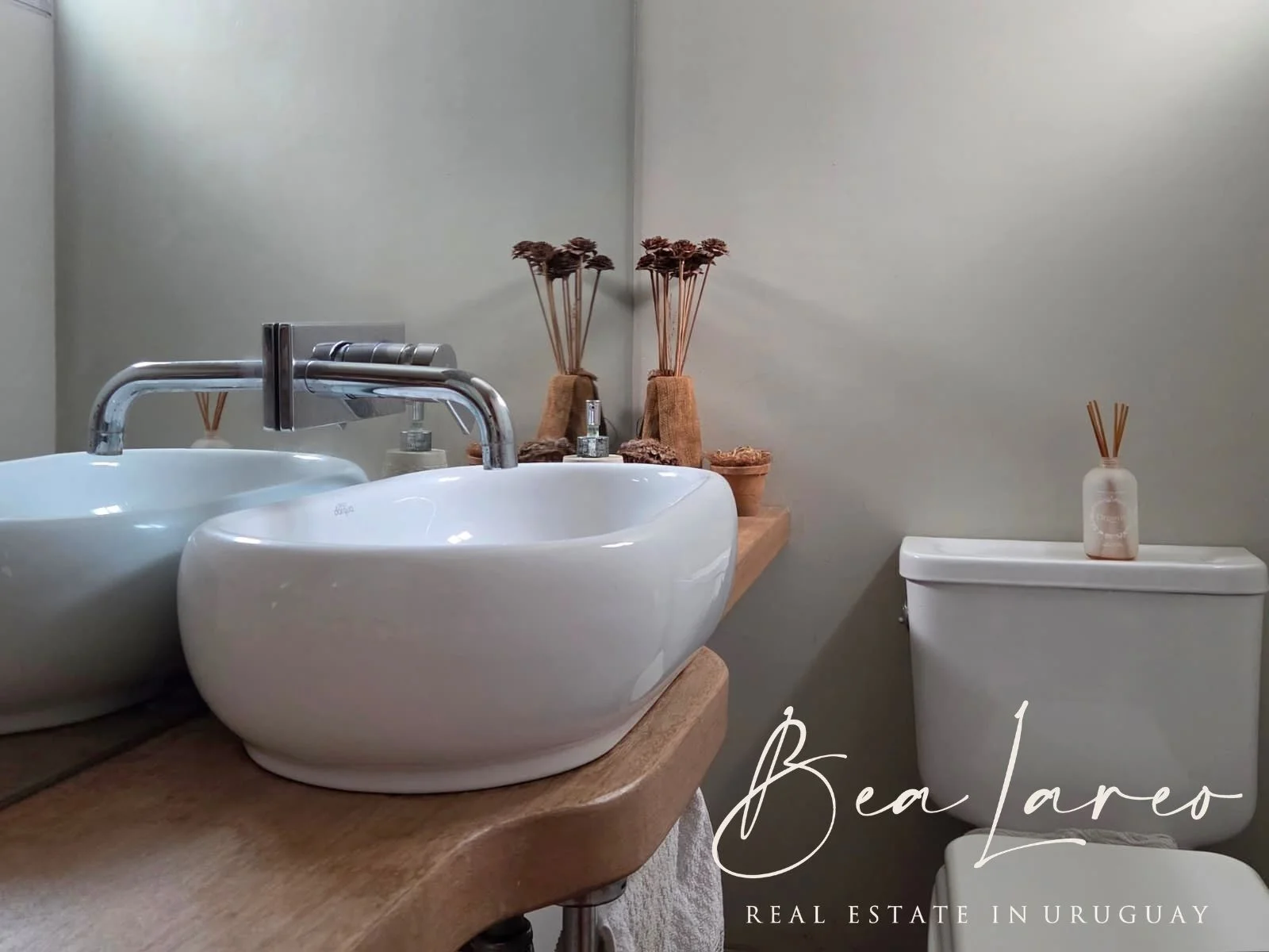 La recepción con toilette y despojador se abre a un amplio y luminoso living con estufa a leña con acceso a la terraza, al igual que el comedor independiente.