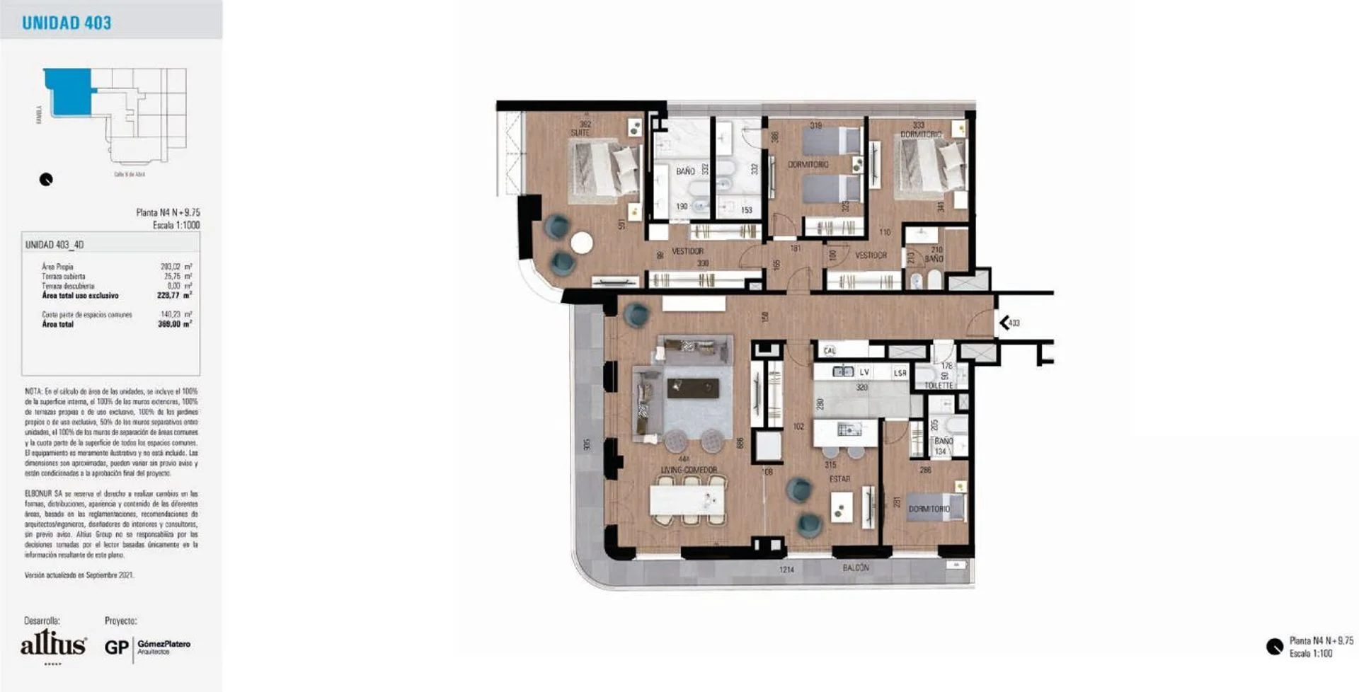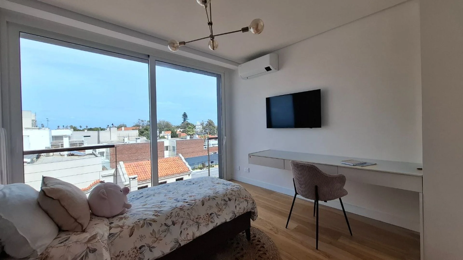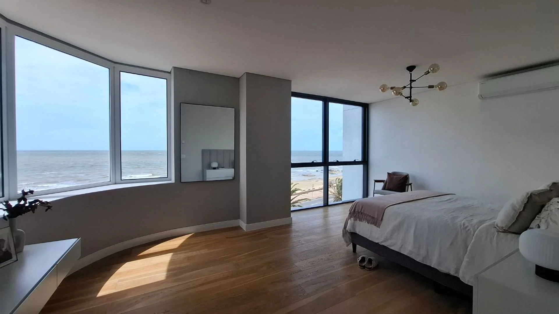 Unidad 403. Espectacular planta de 200m2 construidos más 26m2 de terraza en equina con vista a la Rambla. Pasillo de entrada con baño social. Living comedor en esquina y estar, ambos con salida a la terraza. Cocina semi definida, doble mesada con muebles aéreos y bajo mesada, anafe, horno y campana y placard tipo alacena. Pequeño dormitorio en suite con salida al balcón. 3 dormitorios en suite, el principal con vestidor y vista la mar. Todos los ambientes cuentan con aire acondicionado.