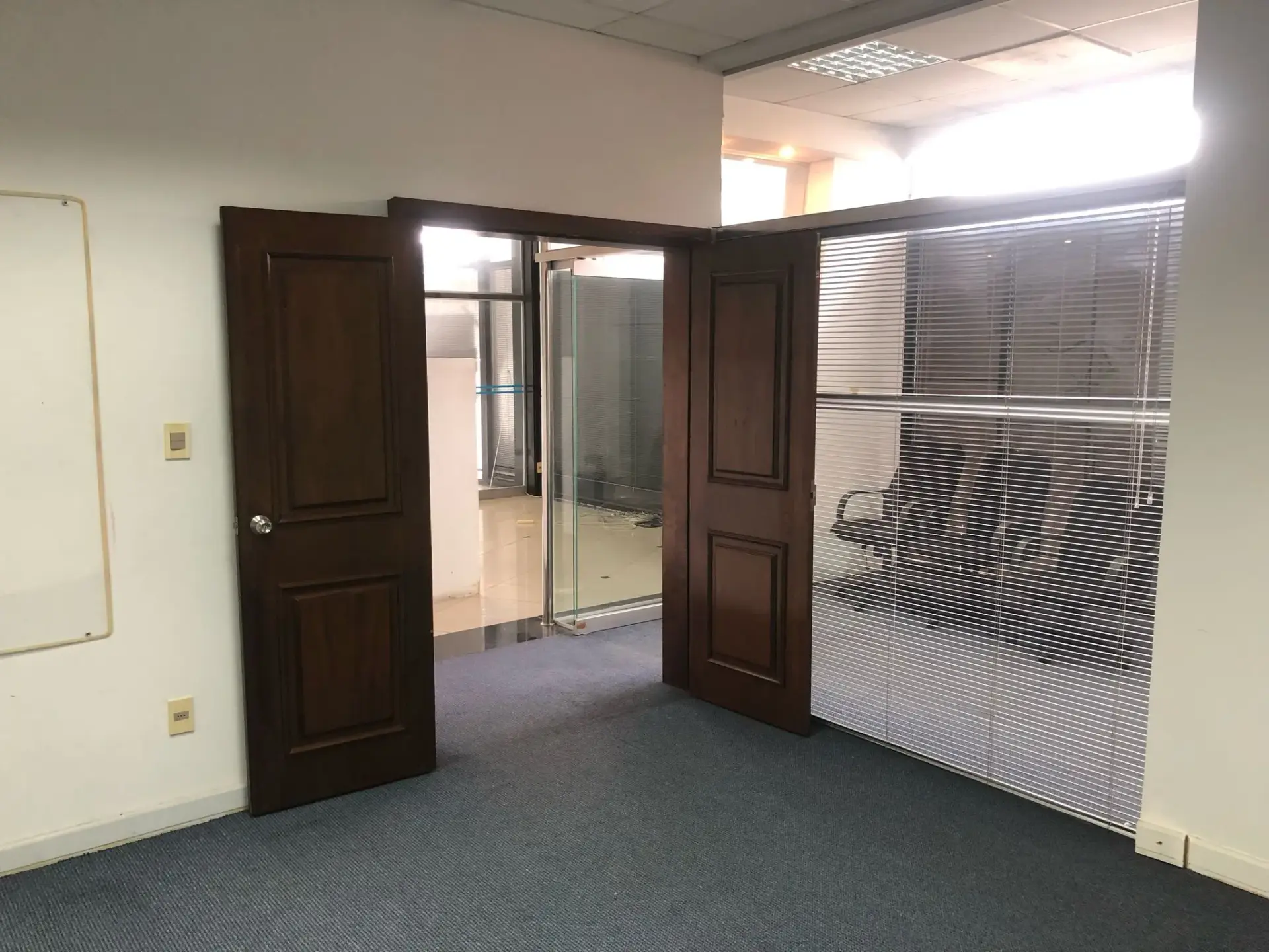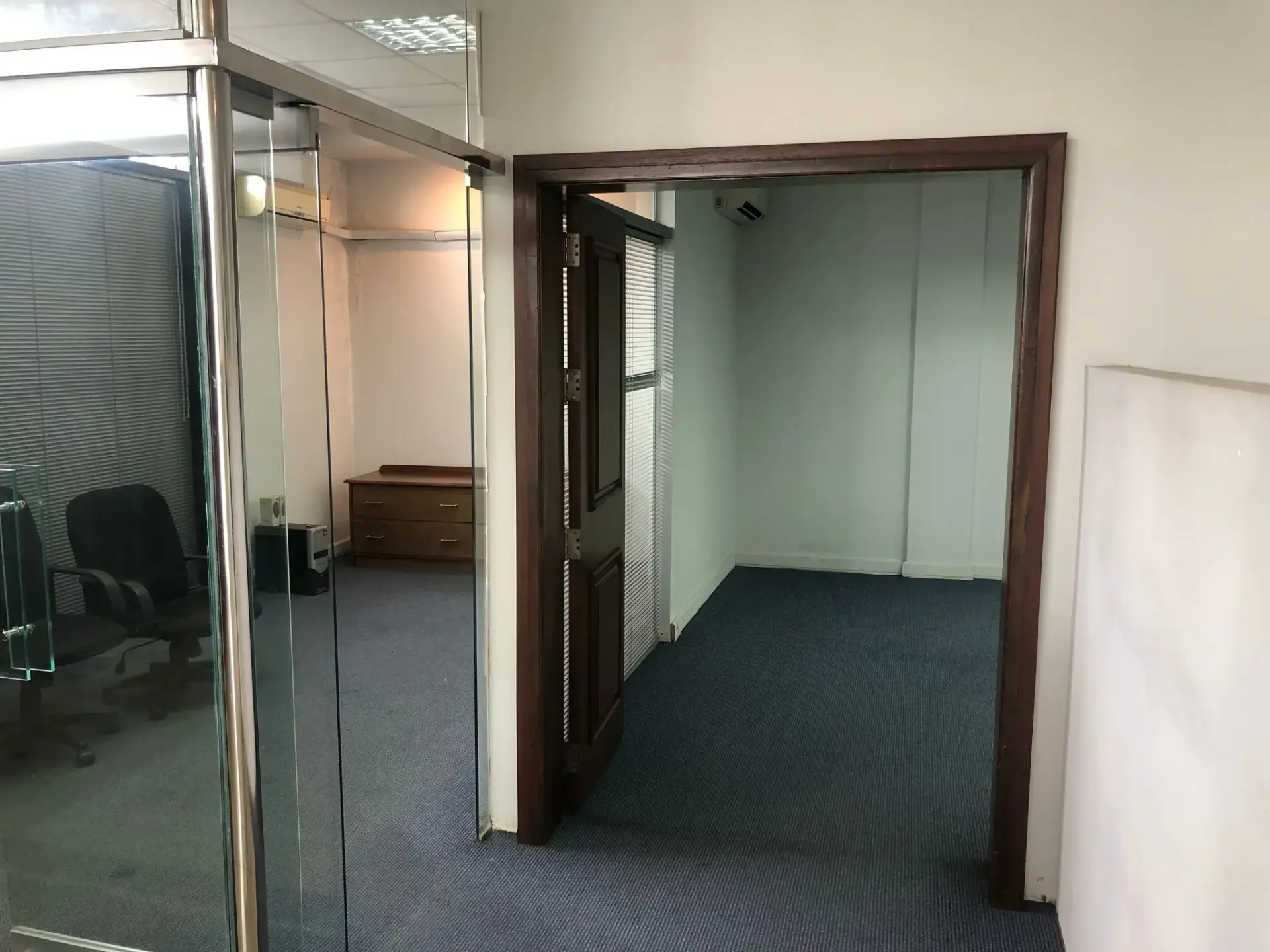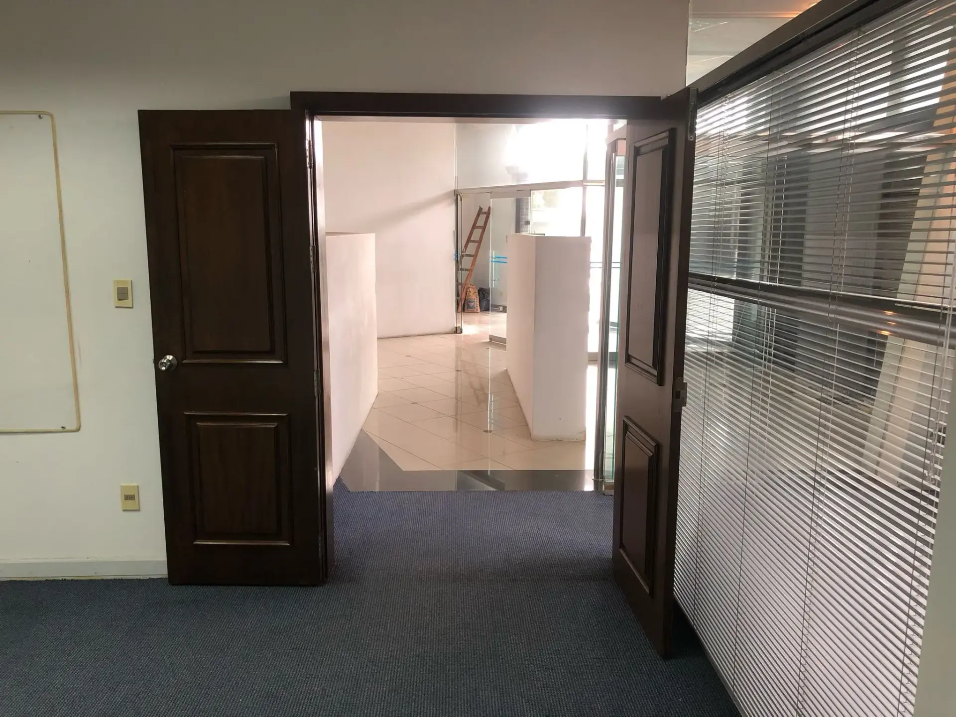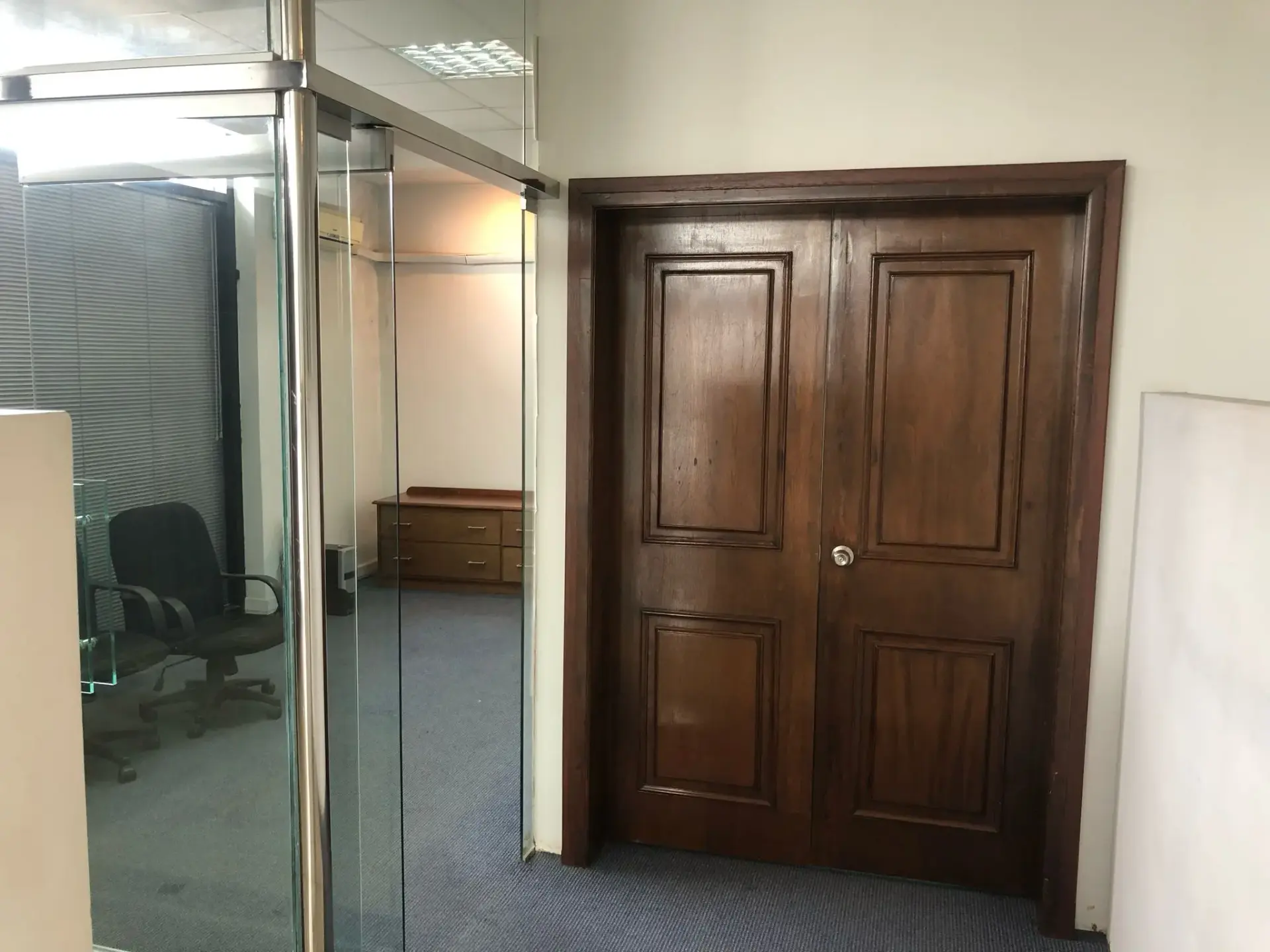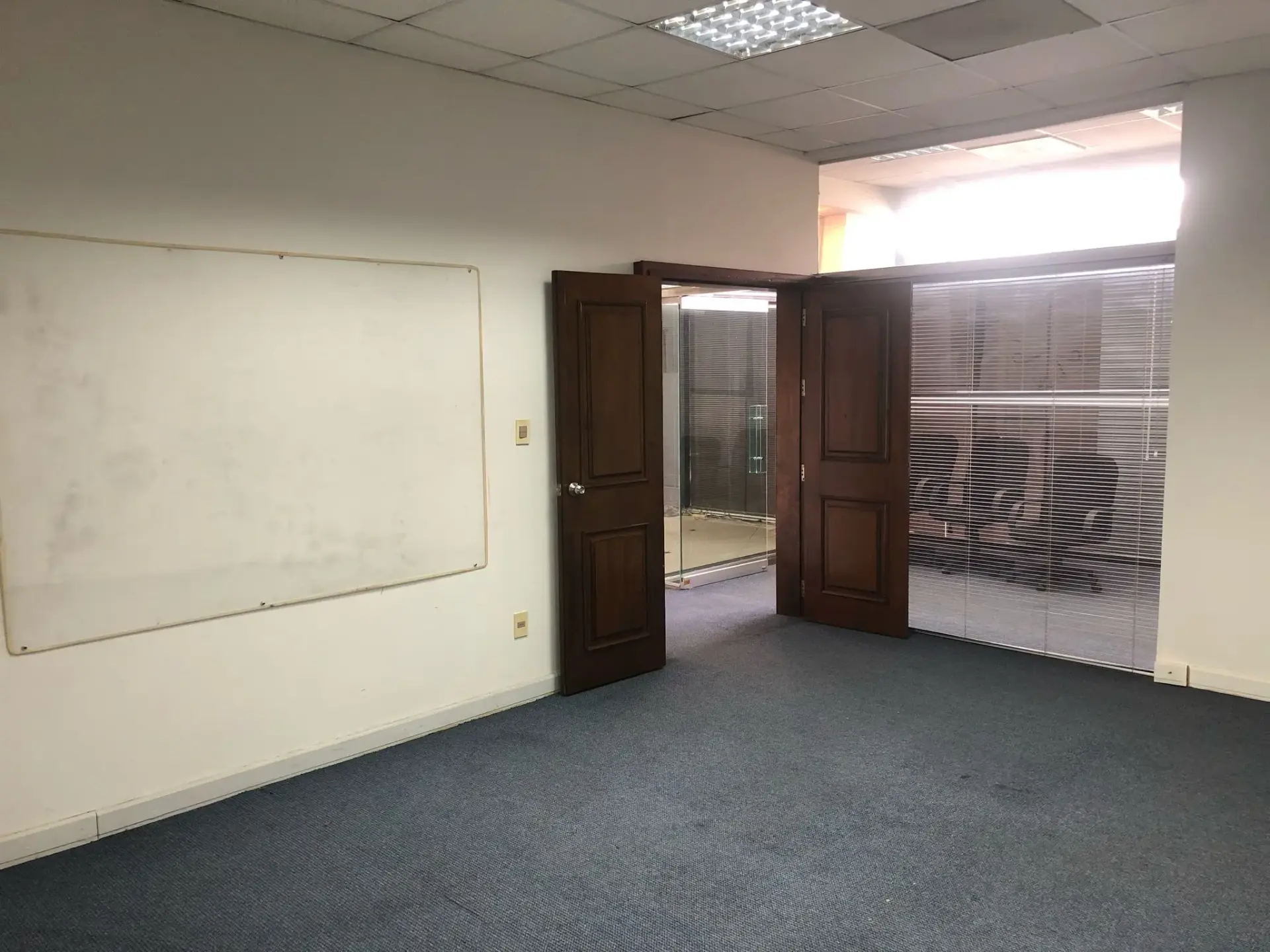 Gran sala de reuniones, 4 salas privadas, 3 ambientes amplios, 2 baños, cocina definida y un estacionamiento privado hacia el fondo de la propiedad.