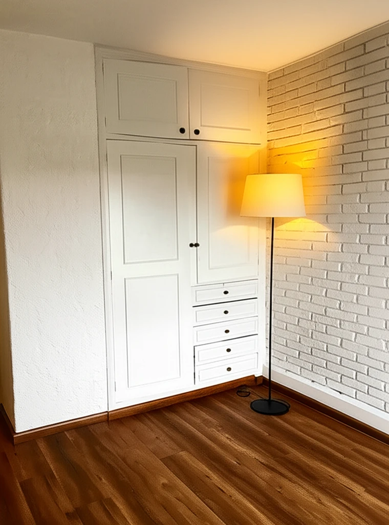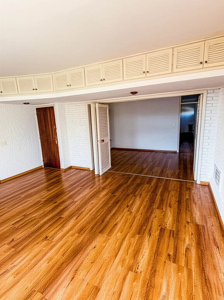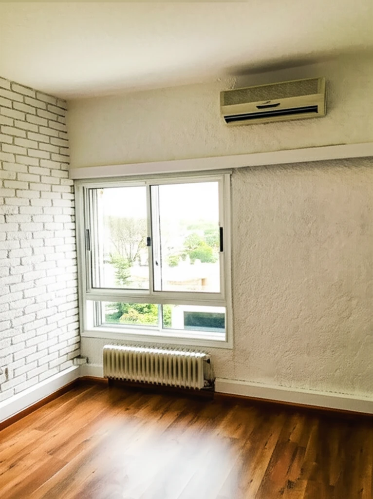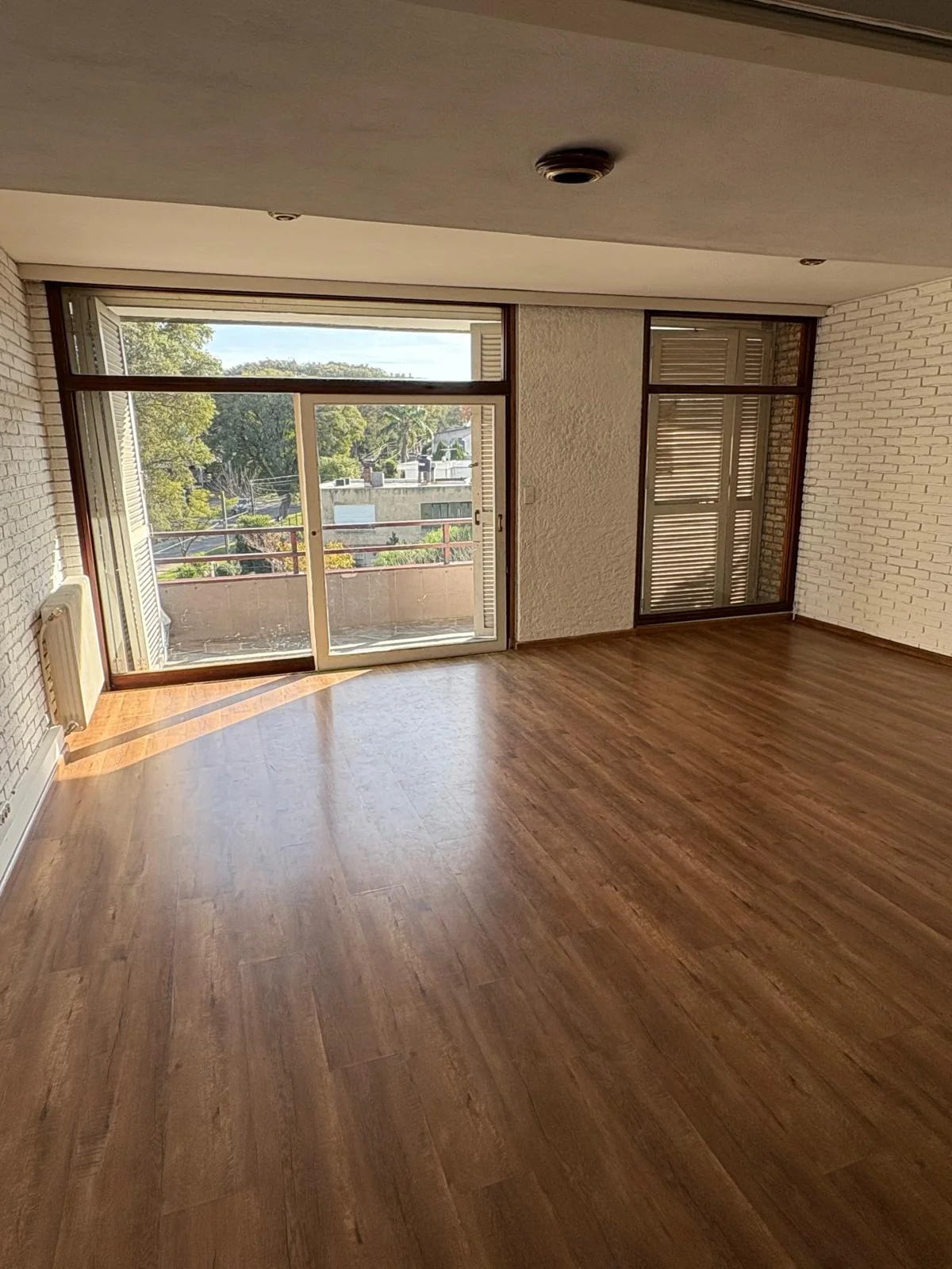El apartamento dispone de dos baños y una cochera en el edificio. Las áreas presentan pisos de madera y detalles de paredes de ladrillo pintado, ofreciendo un entorno funcional con buena distribución de ambientes.