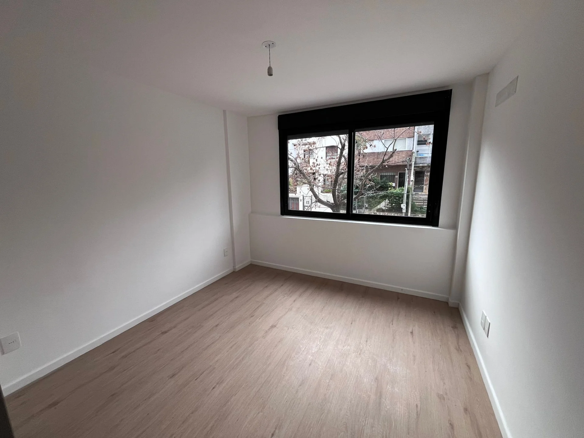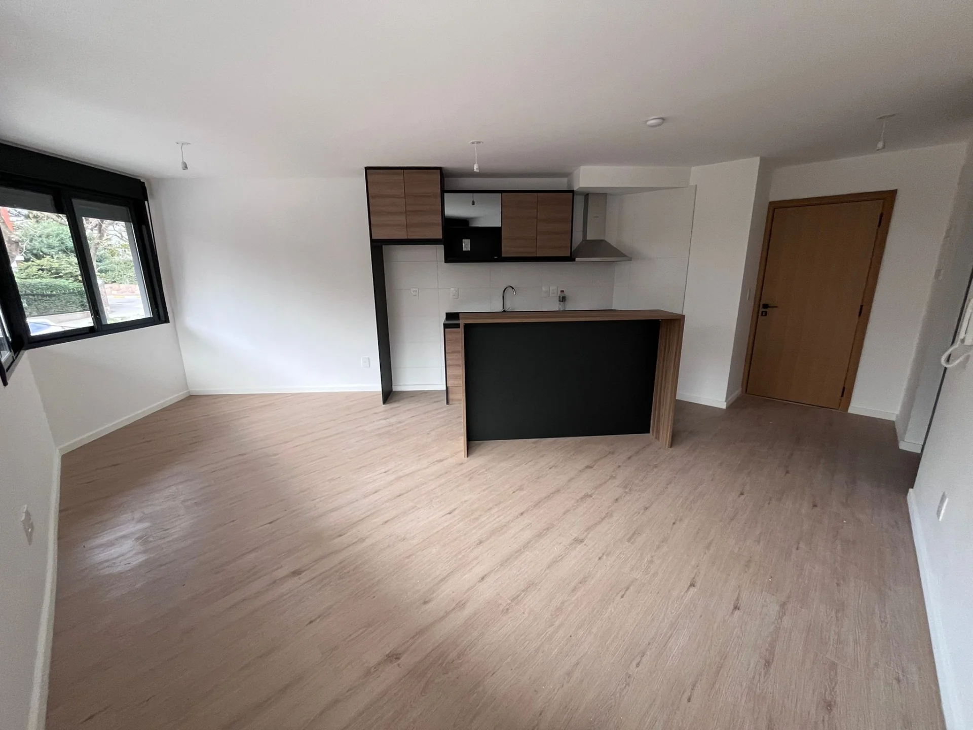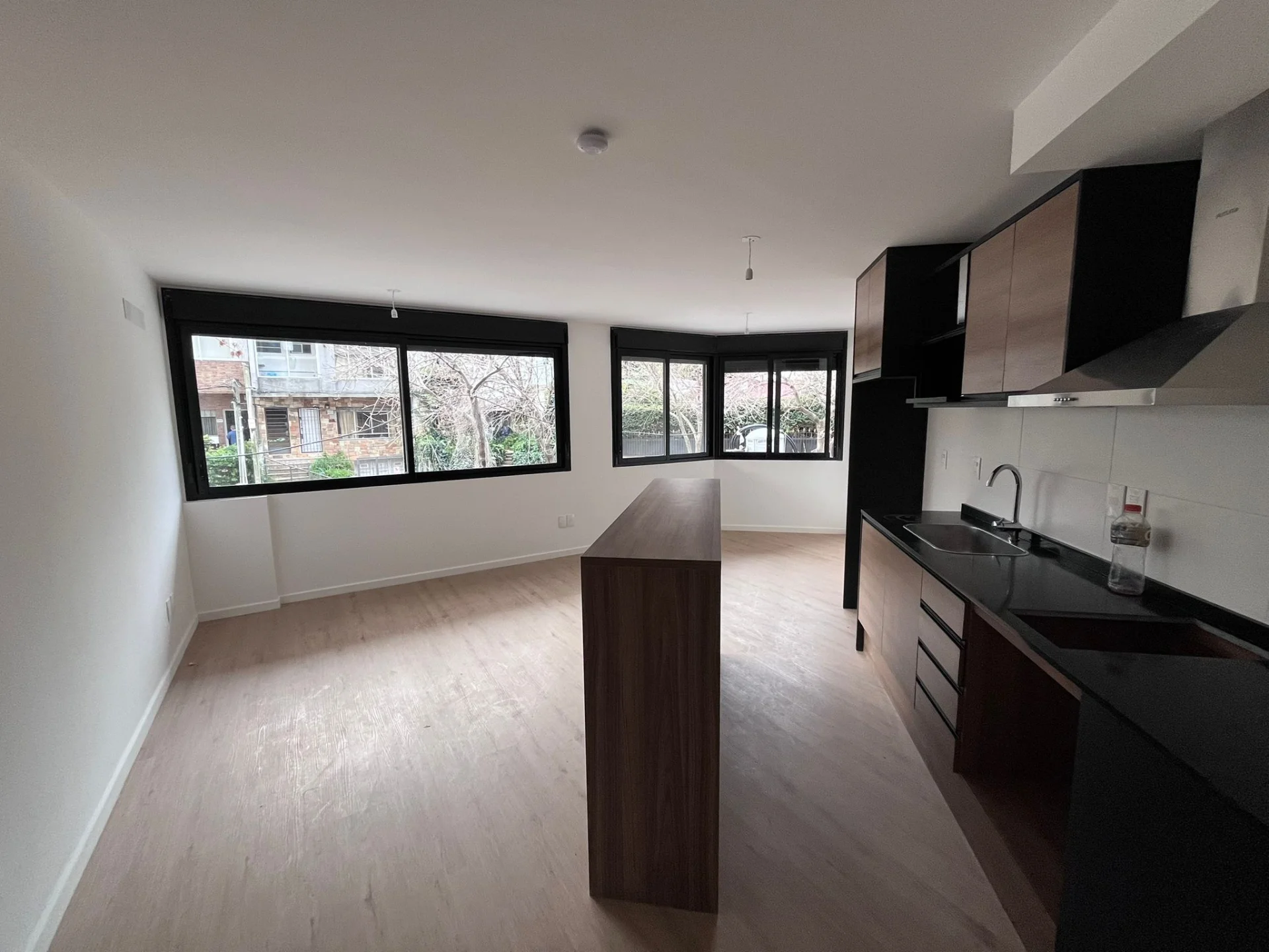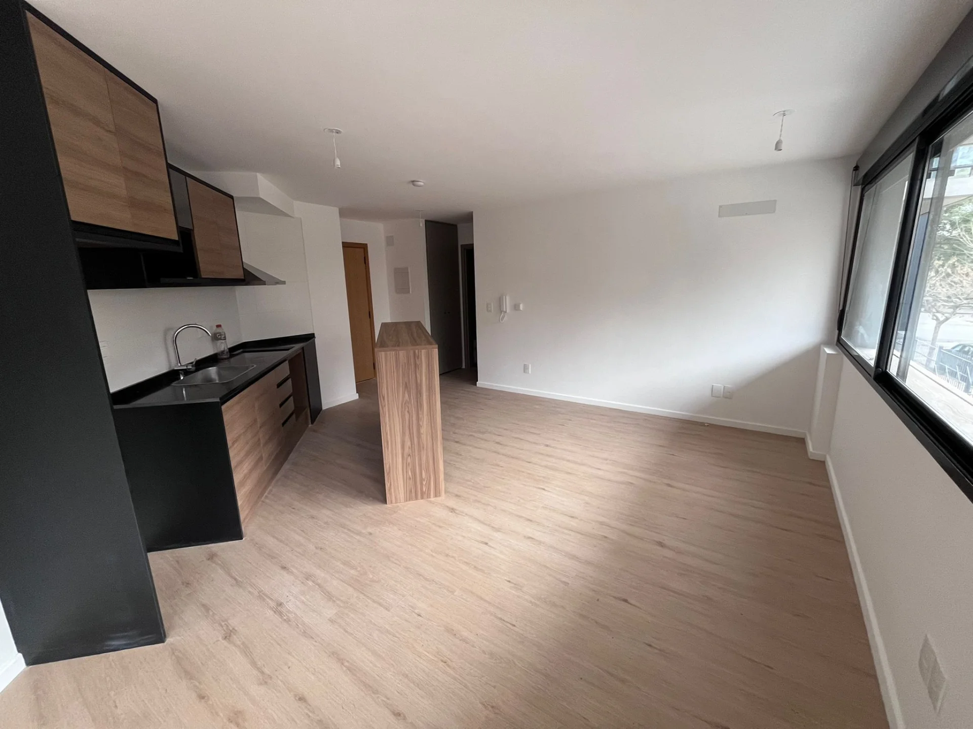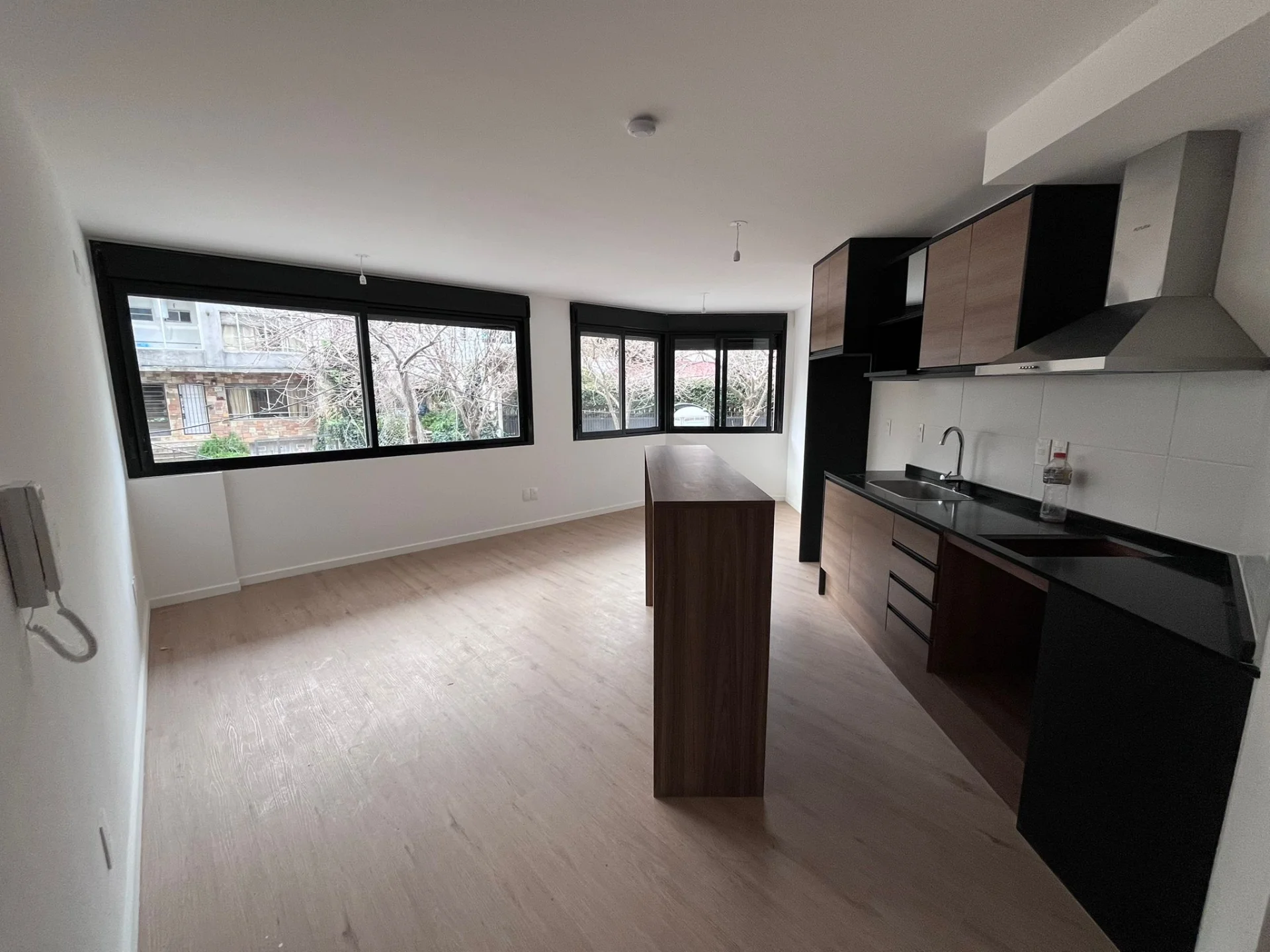 El apartamento se encuentra en un primer piso al frente y cuenta con un dormitorio definido con placares. El living posee cocina integrada, campana extractora, se entrega equipada con anafe y horno empotrado. El ambiente principal ofrece ventanales al exterior.