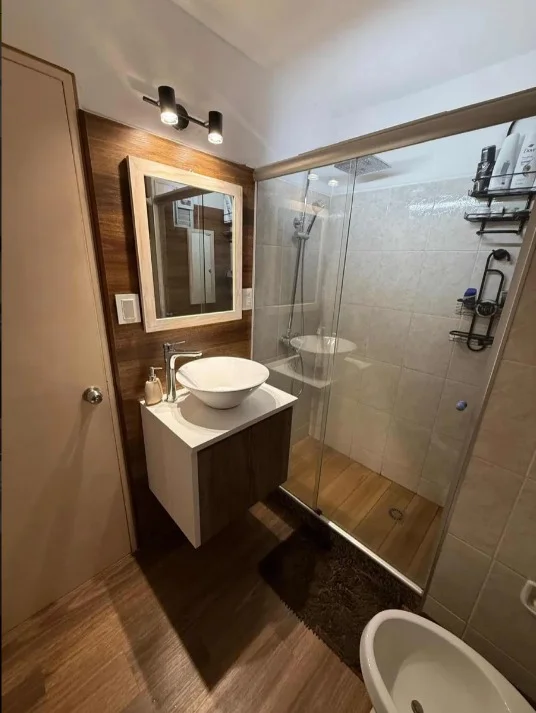 Baño con extractor, mampara de vidrio y mueble aéreo