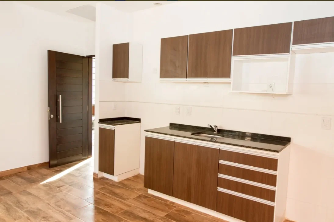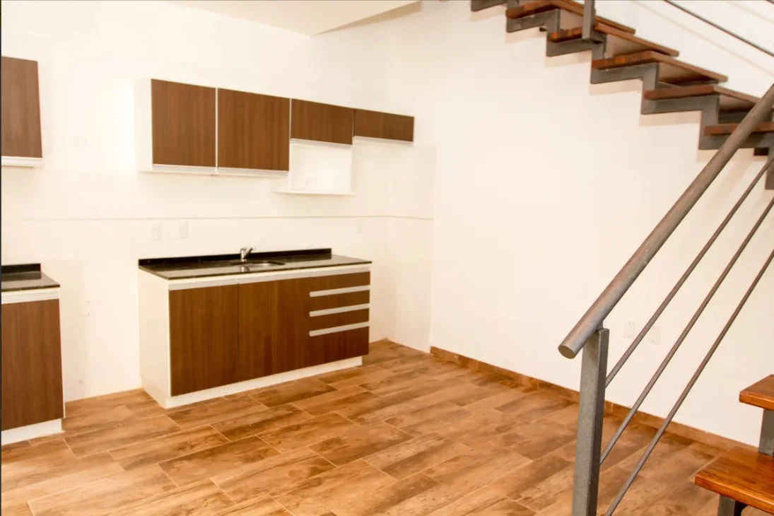 Amplio living comedor con cocina integrada, equipada con muebles aéreos y bajo mesada.