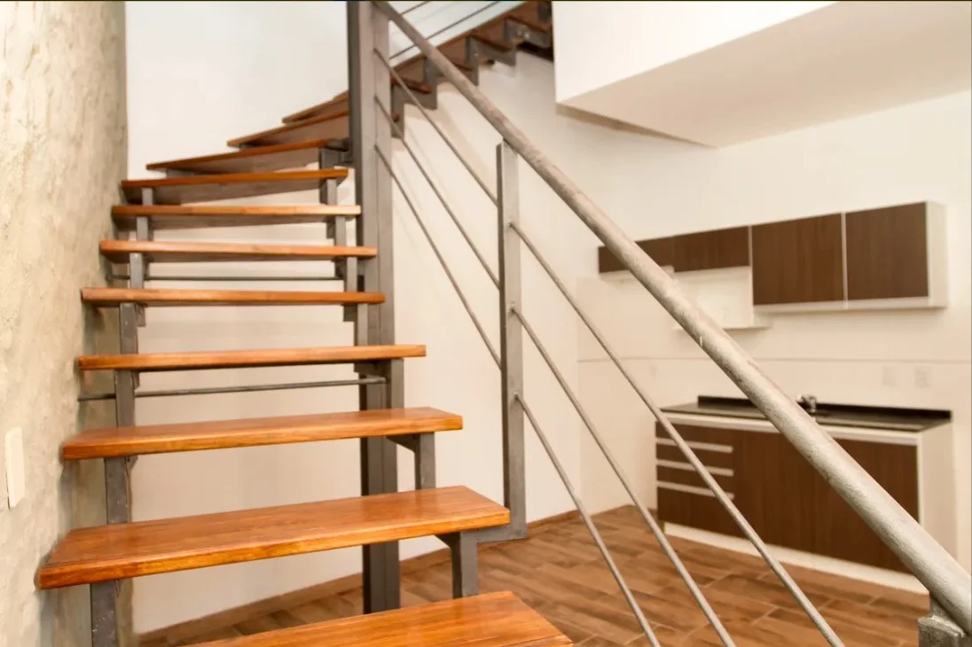 Escalera que conduce a un dormitorio luminoso con ventanas con rejas.