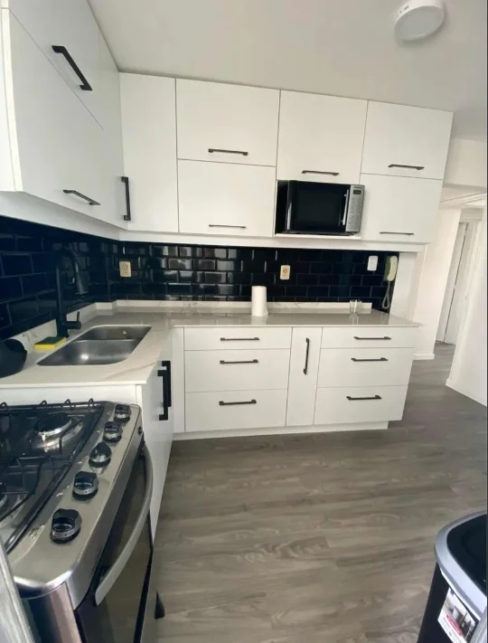 Cocina definida, moderna y cómoda, equipada con muebles aéreos y bajo mesada, con terraza lavadero independiente.
