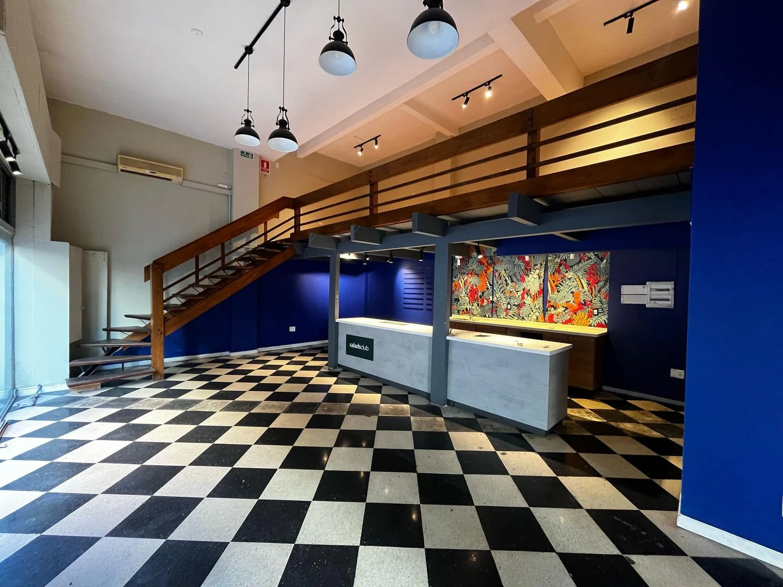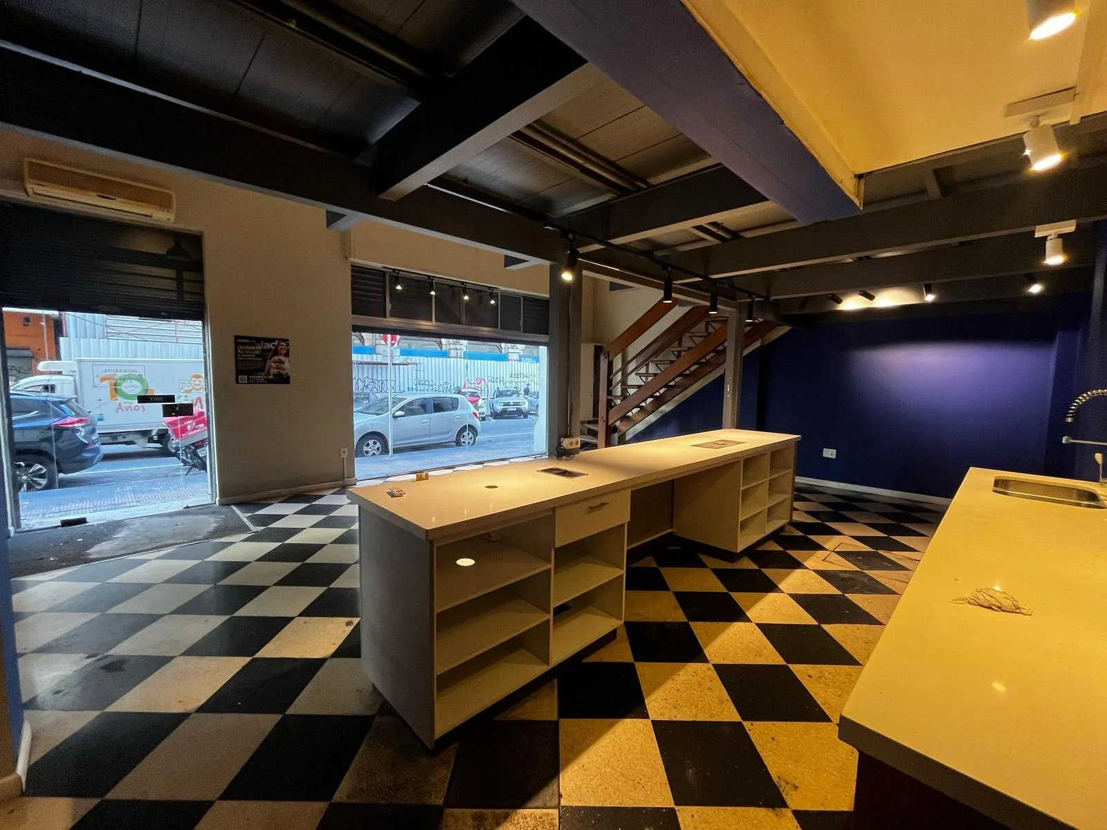 Amplio local comercial con gran frente, tiene planta alta que puede ser utilizada como depósito o como parte del salón. Dos baños. Cortinas de enrollar. 13.6 mts frente.