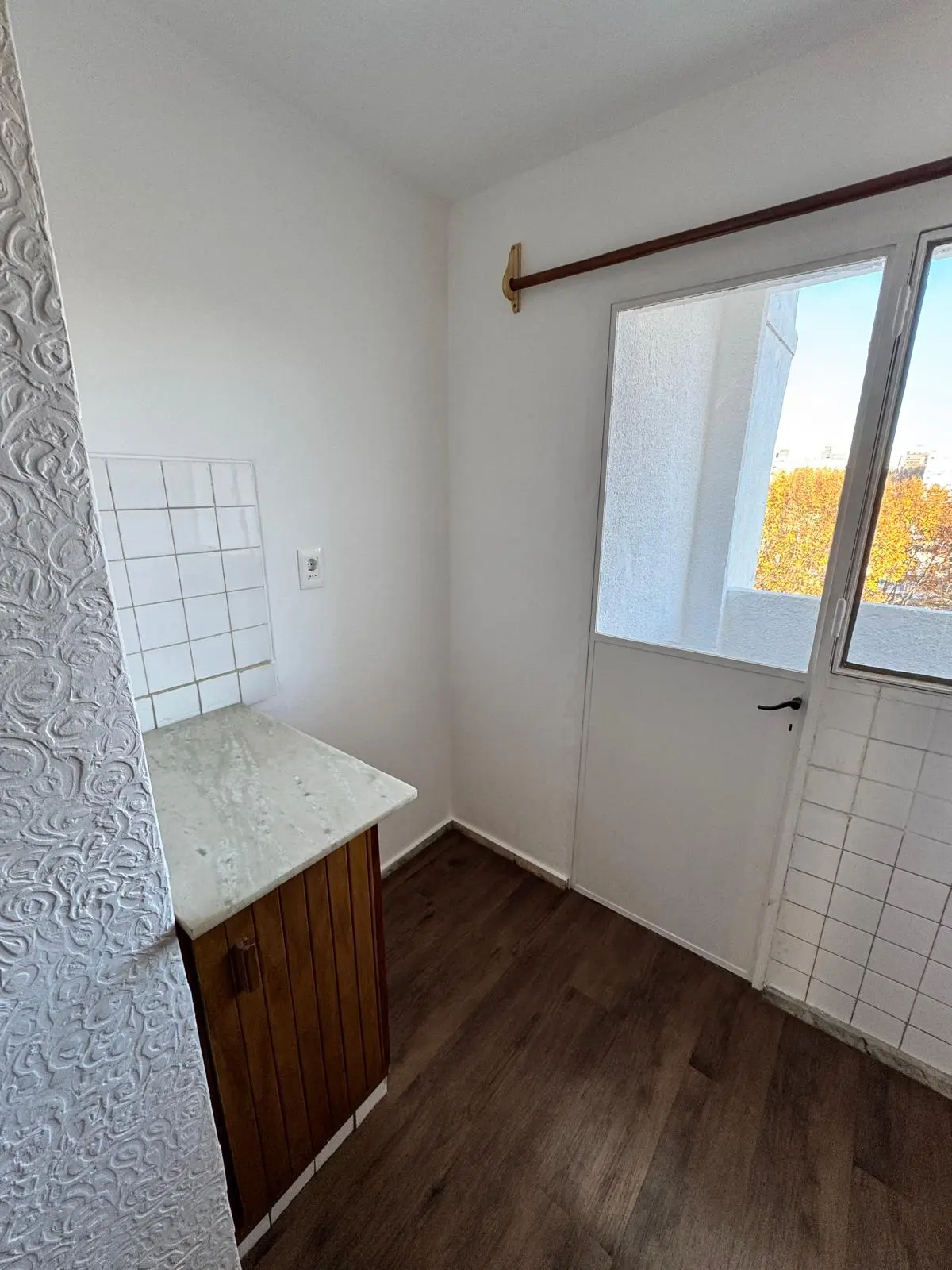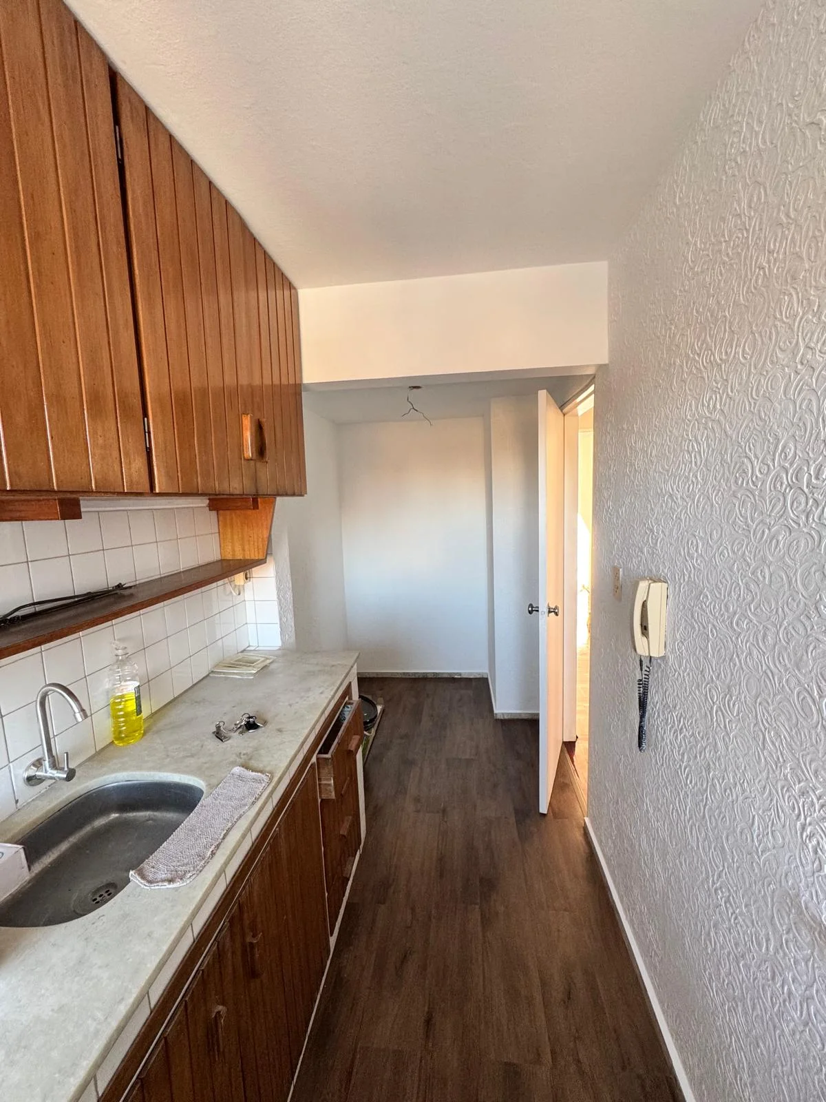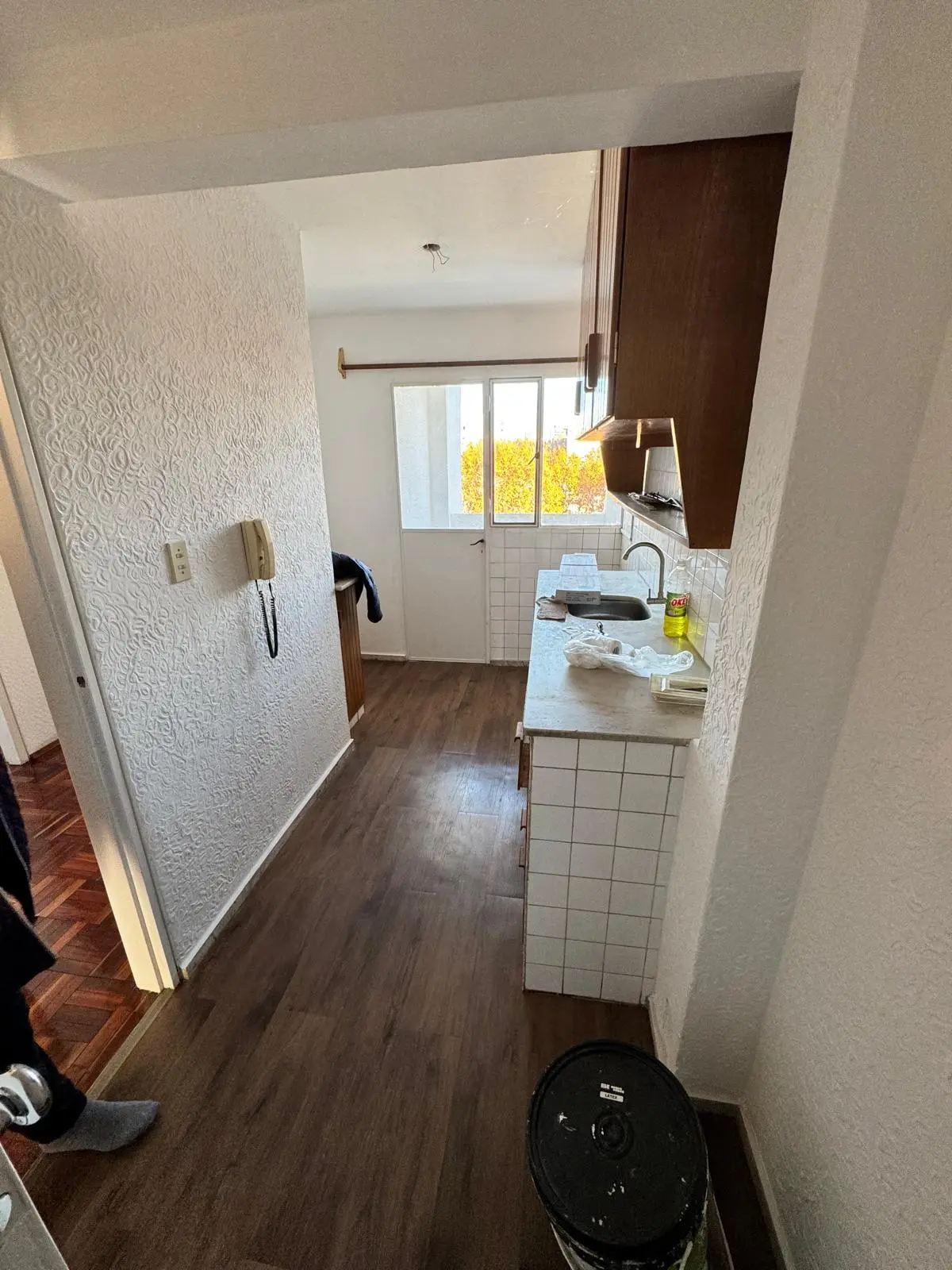 Cocina con placares sobre y bajo mesada. Salida hacia terraza abierta de cómodas dimensiones.