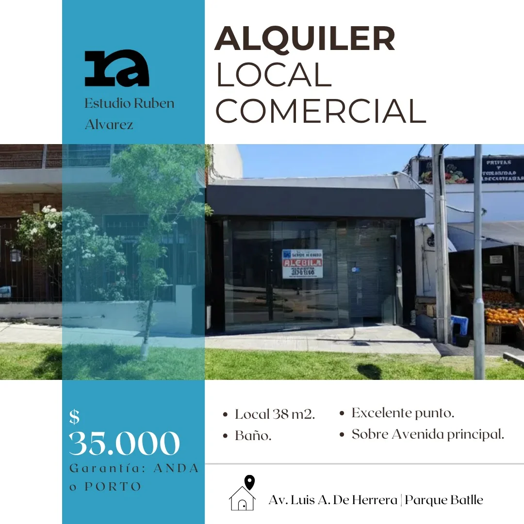 Local comercial ubicado sobre Avenida Luis Alberto de Herrera entre Ayacucho y Comodore Coe , buen punto comercial. Son 38 mts2 e incluye baño. Mampostería de material , cubierta de losa y cerámica. Garantías Anda o Porto.