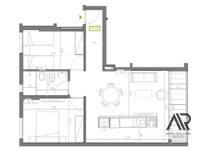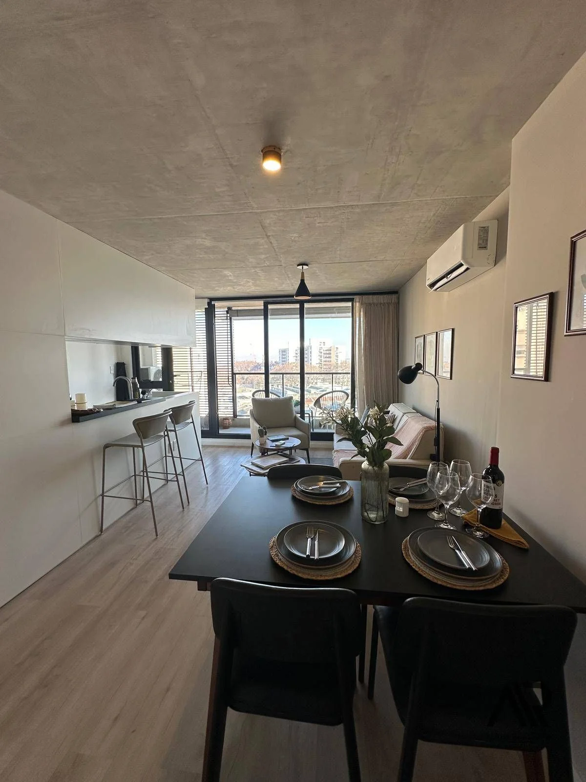 La unidad cuenta con un cómodo estar comedor con cocina en isla y salida a terraza, 2 dormitorios y un baño completo.