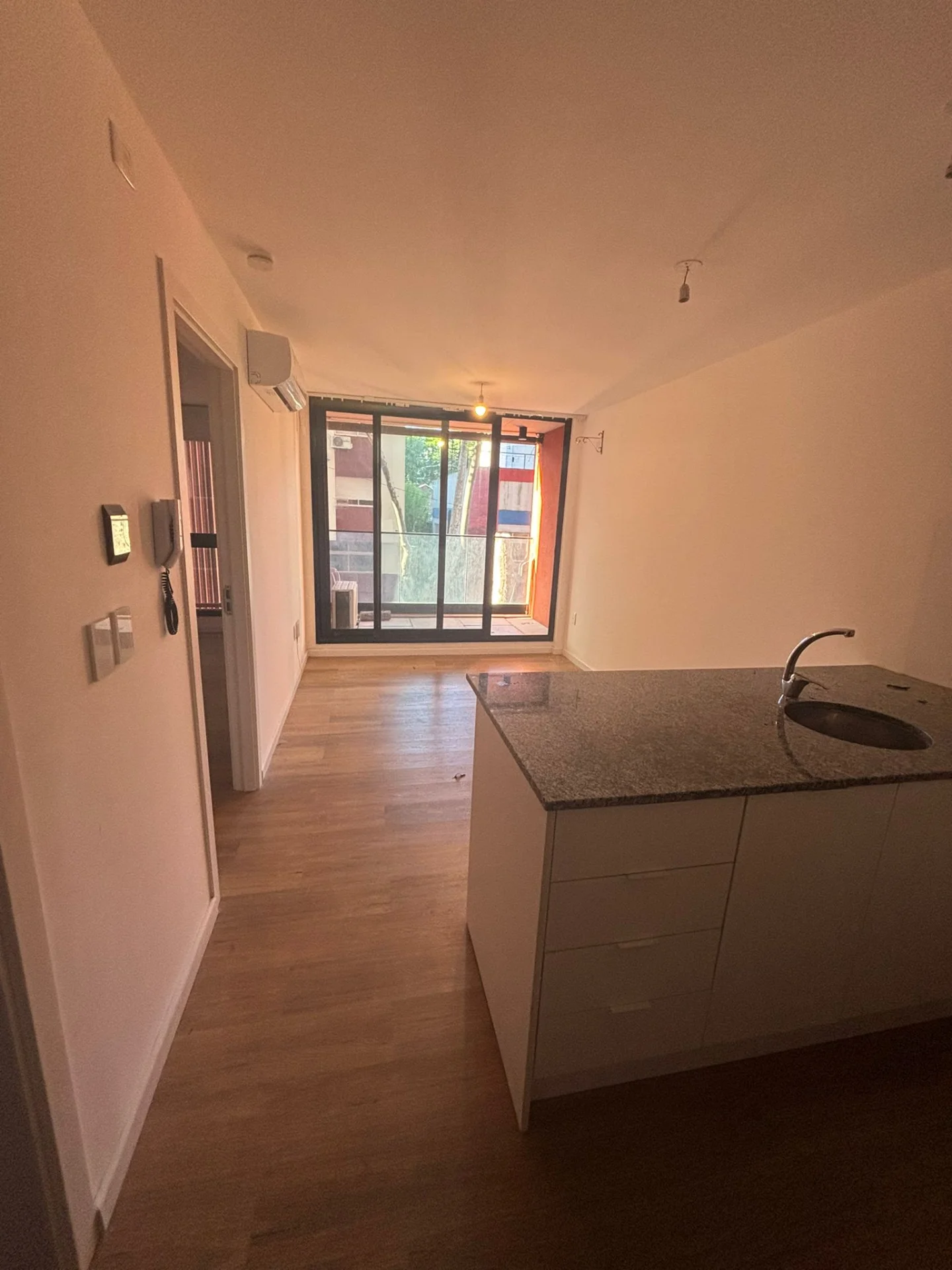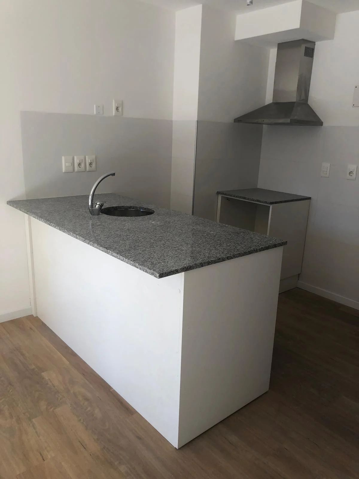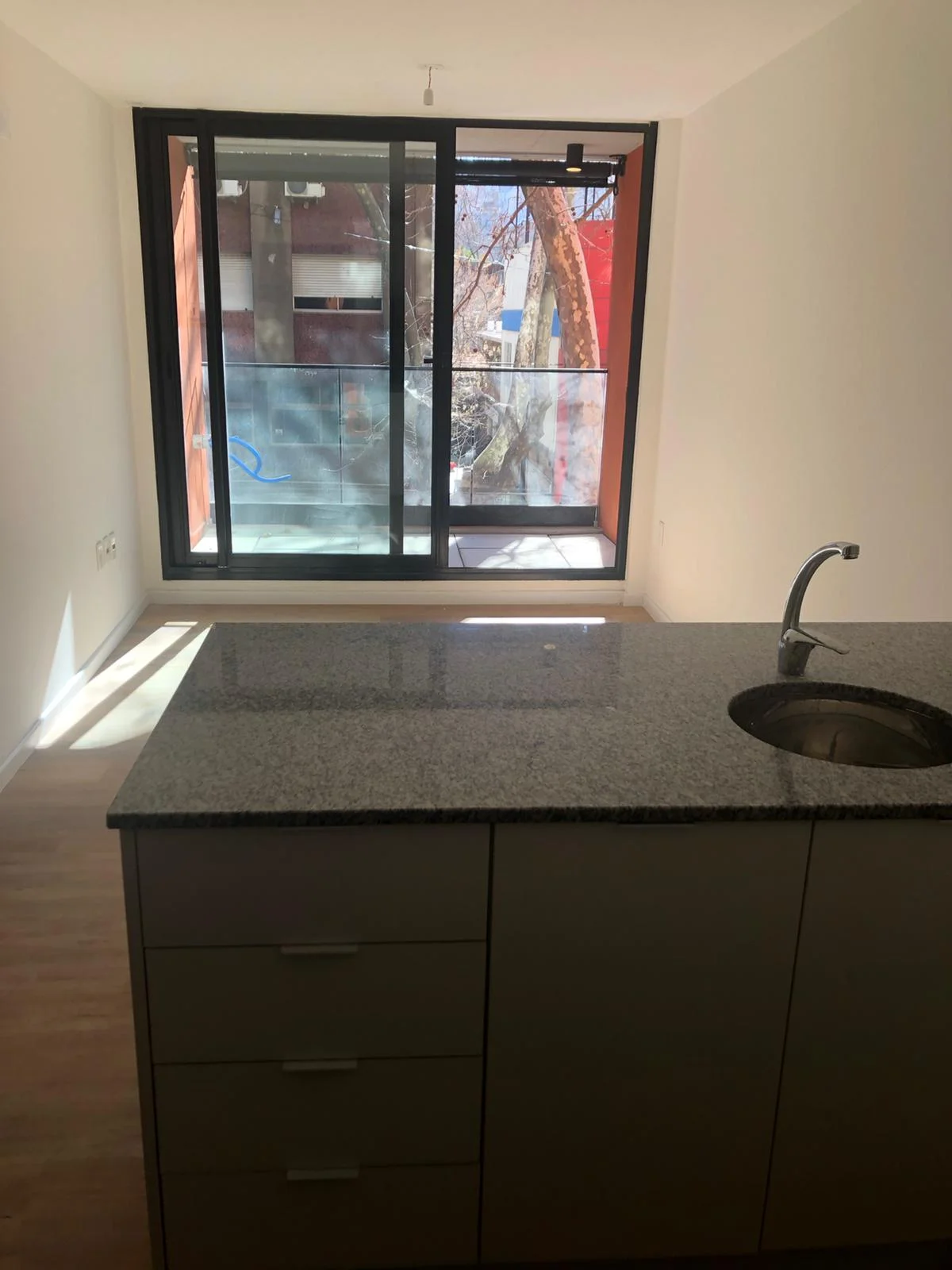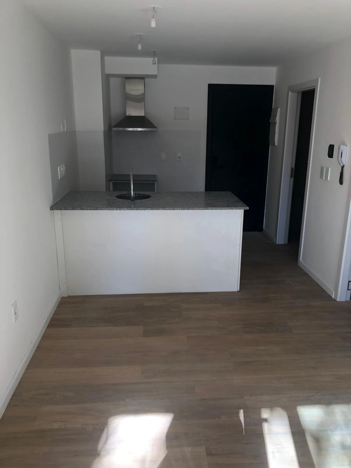 Living comedor con cocina integrada, pisos símil madera. Cómoda mesada de granito, que sirve como desayunador, salida a terraza.