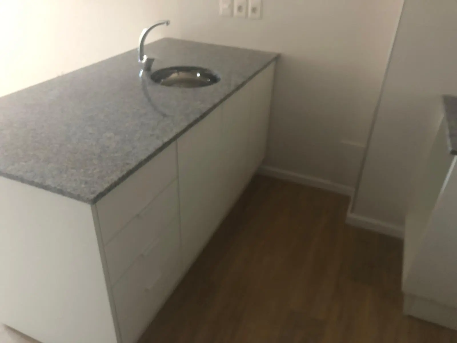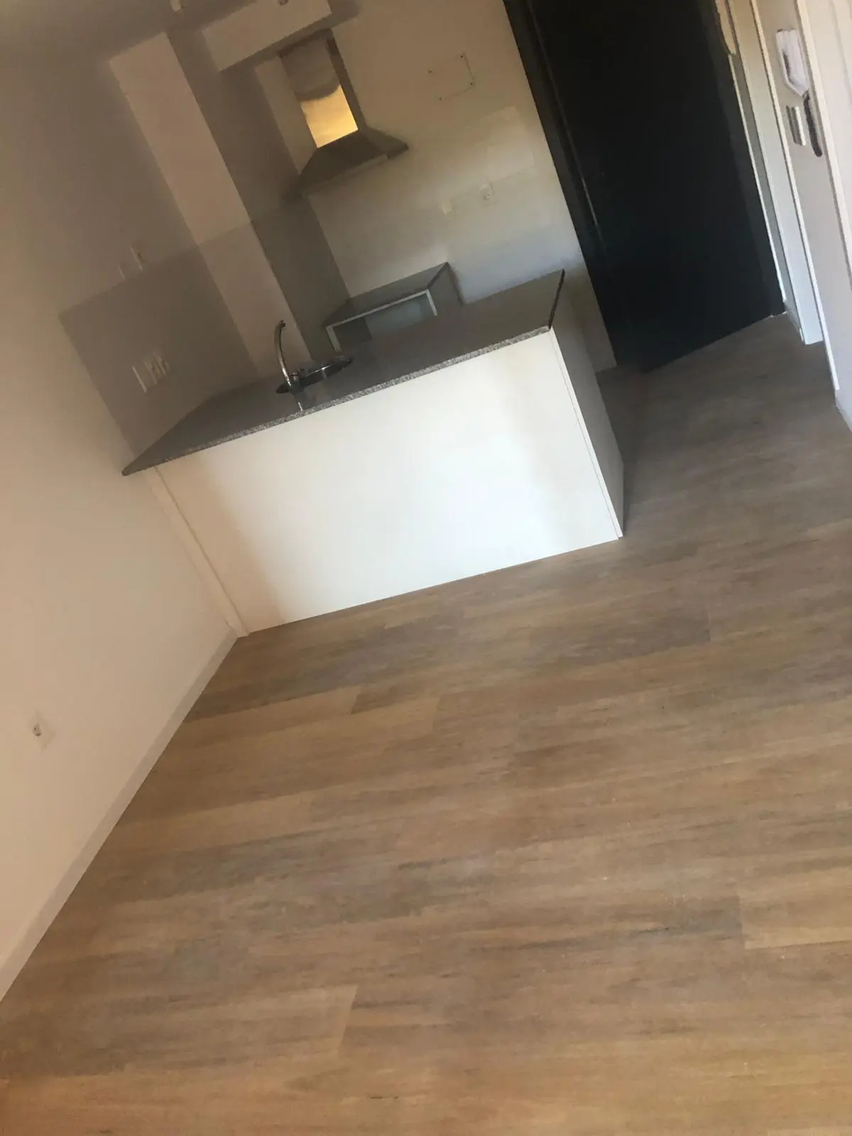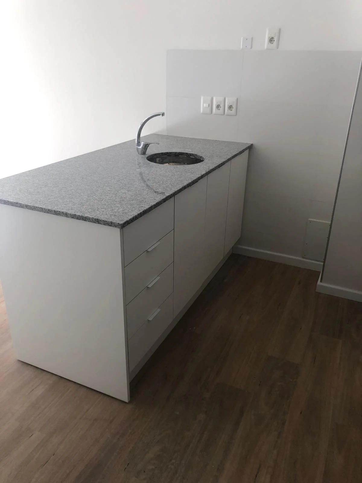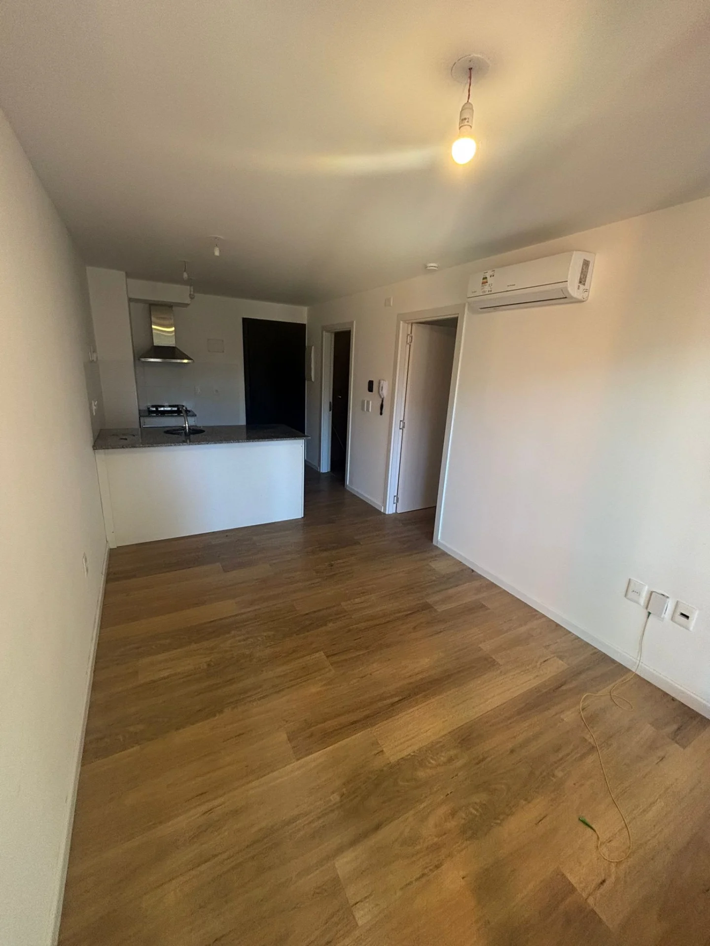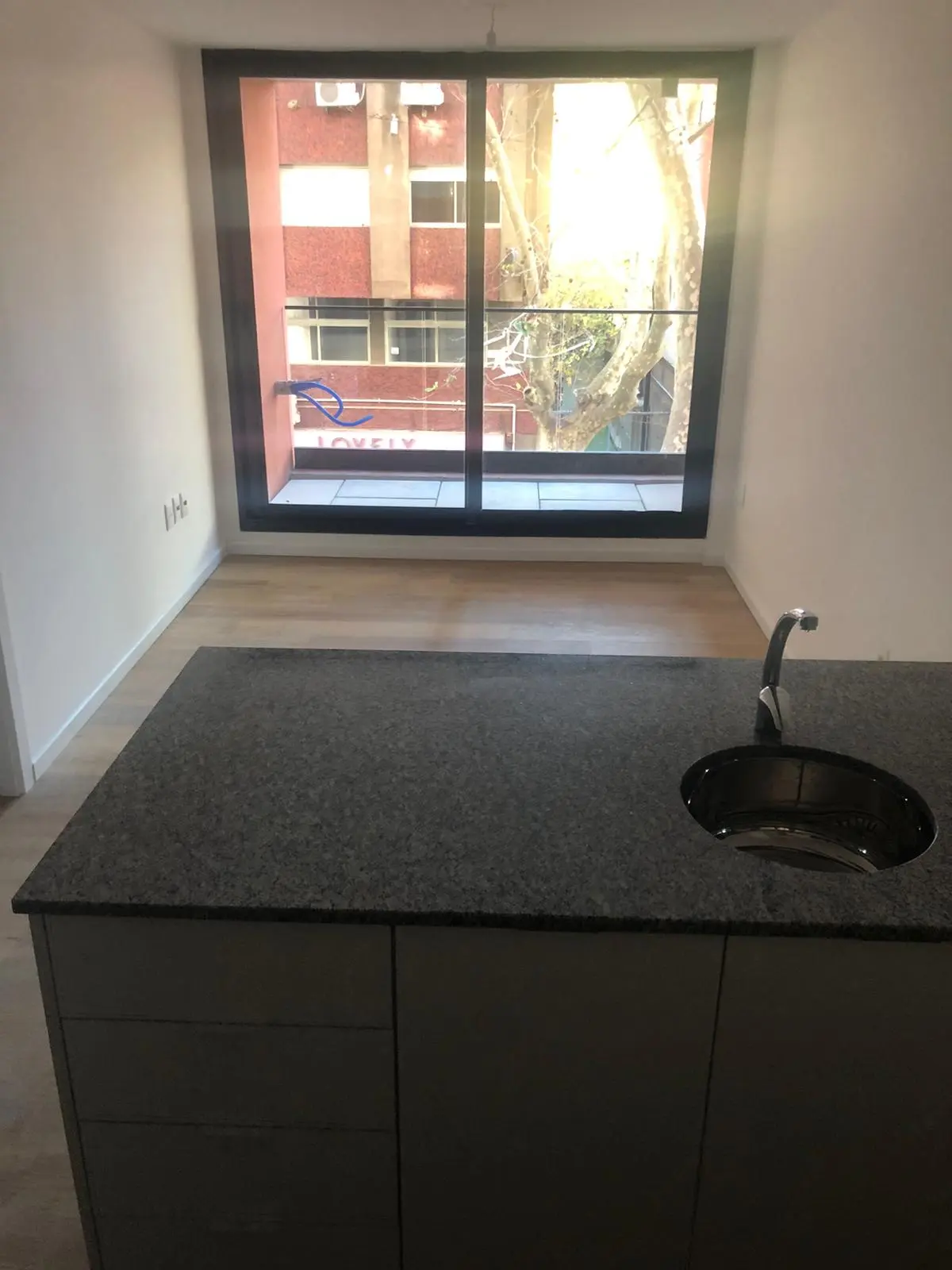 Living comedor con cocina integrada, pisos símil madera. Cómoda mesada de granito, que sirve como desayunador, salida a terraza.