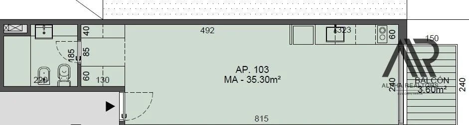Un ambiente con cocina integrada, salida al balcón y un baño completo.