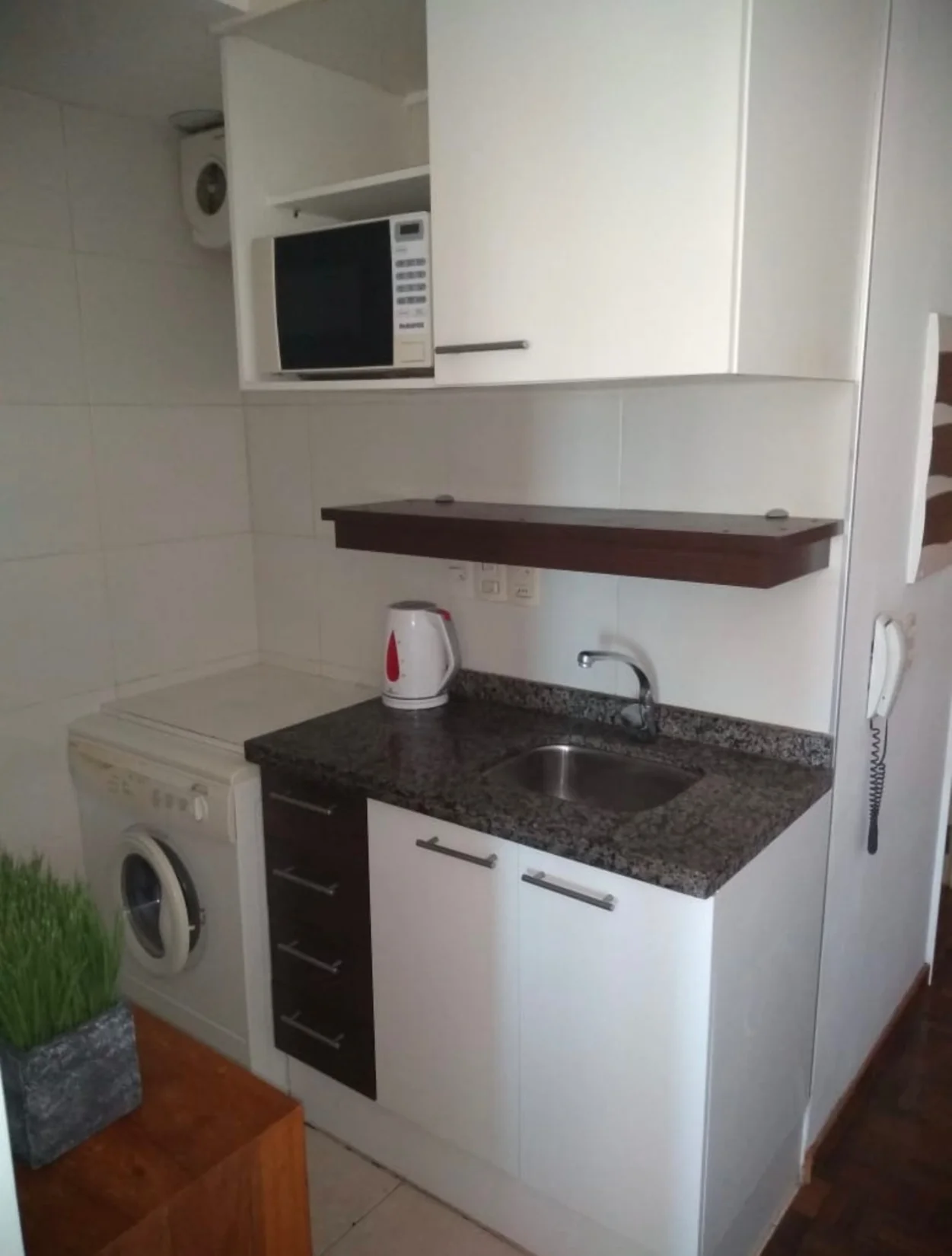 Cocina independiente, con armarios sobre y bajo mesada. Incluye heladera, microondas, jarra eléctrica y lavarropas.