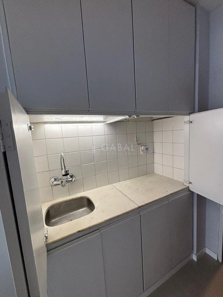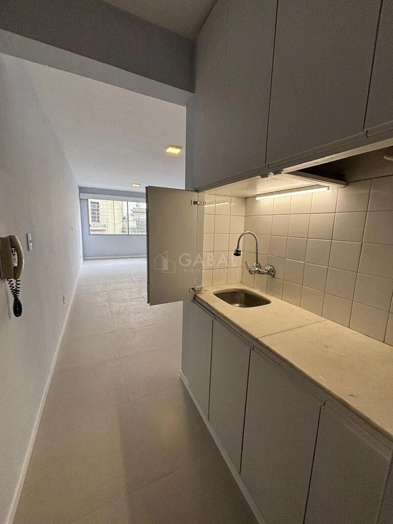 Kitchenette integrada: mesada, pileta de acero inoxidable con canilla monocomando, muebles bajo y sobre mesada. Cuenta con puertas plegables dobles para ocultarla completamente si se desea.