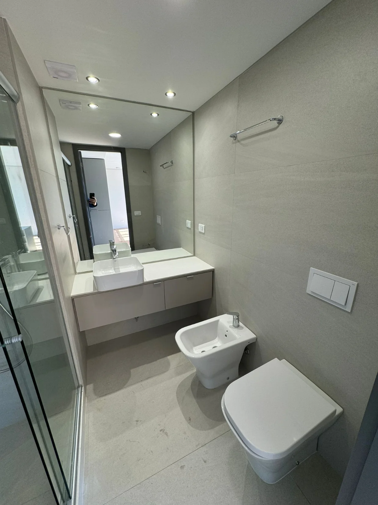 La unidad cuenta con: anafe, placares sobre y bajo mesada, losa individual eléctrica, aire acondicionado, mampara de vidrio, jardinera con riego controlado, persianas eléctricas, toldos exteriores motorizados con control remoto, cerradura electrónica en puerta de acceso a la unidad, mueble móvil con ruedas con conexiones y divisiones con muy buena capacidad de almacenamiento funcional lo que hace que quede dividido en dos sectores.