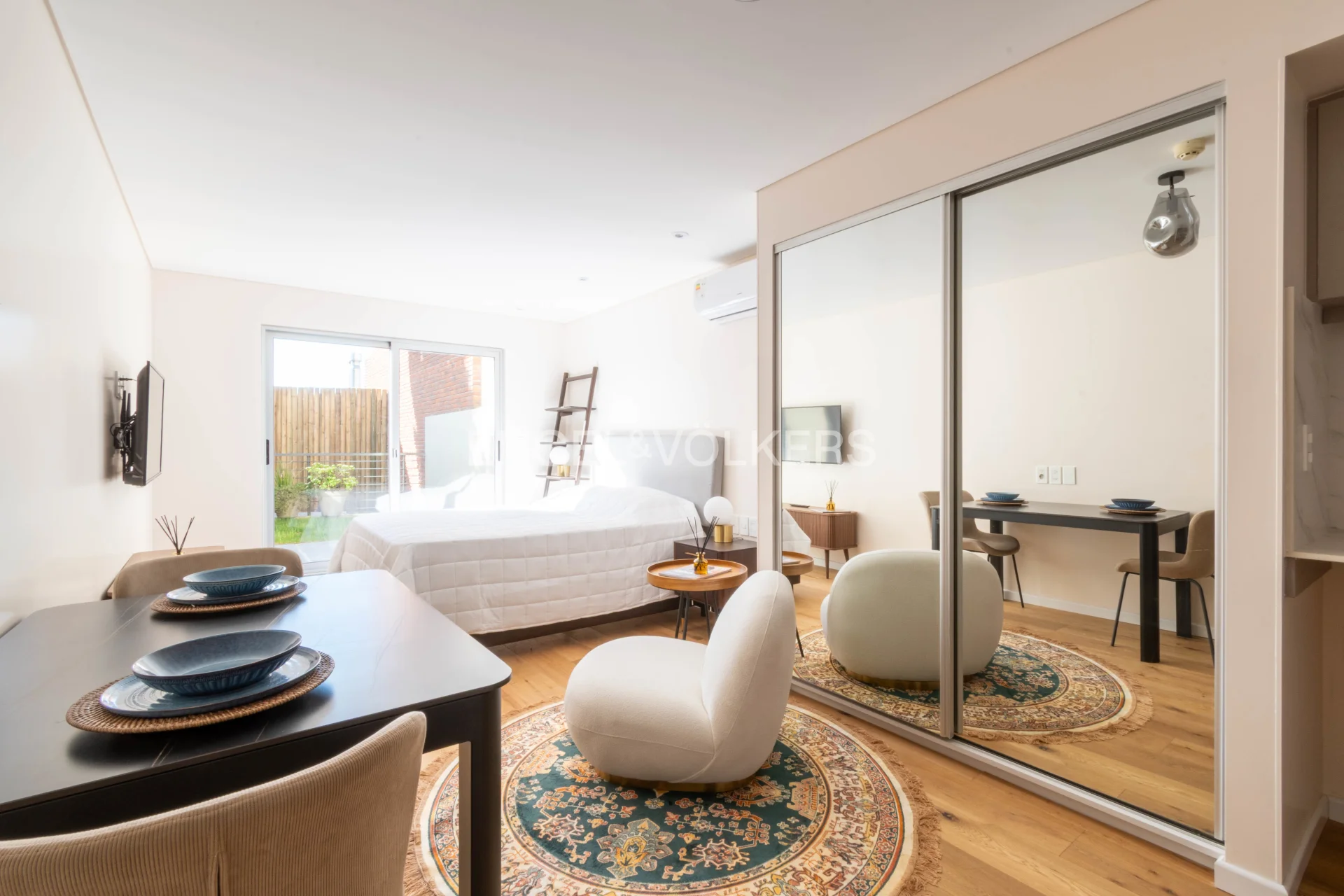 Esta unidad monoambiente cuenta con un amplio espacio principal, una cocina parcialmente definida, baño completo y un jardin de uso exclusivo de 18 mt2.