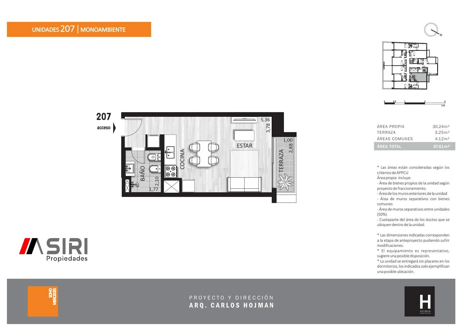 Monoambiente con cocina integrada y baño completo, de 30.24m² (internos), más una terraza de 3.25m².